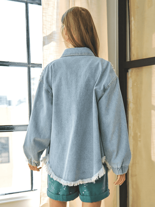Collared Neck Raw Hem Dropped Shoulder Denim Jacket