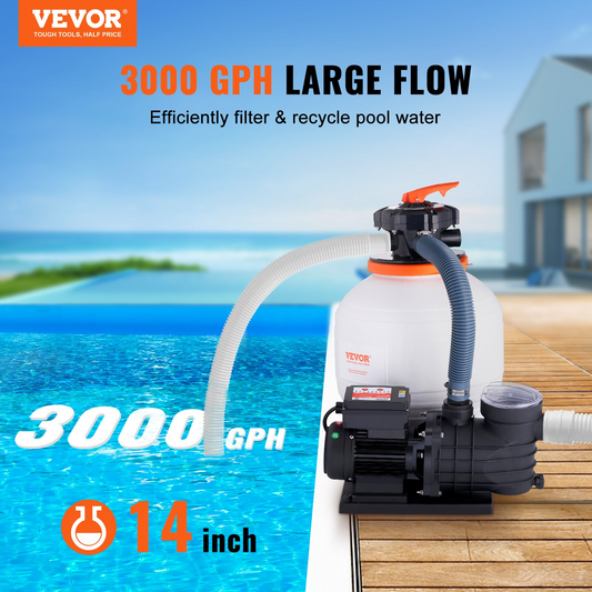 VEVOR Sand Filter Pump for Above Ground Pools, 14-inch, 3000 GPH, 3/4 HP Swimming Pool Pumps System & Filters Combo Set with 6-Way Multi-Port Valve & Strainer Basket, for Domestic and Commercial Pools