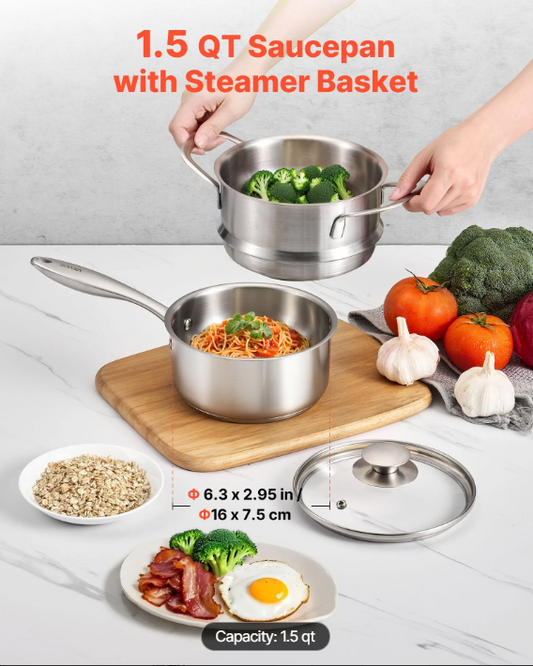 1.5 QT Saucepan with Steamer, Stainless Steel Saucepan with Glass Lid, Multipurpose Nonstick Stainless Steel Sauce Pot with Ergonomic Handle, Friendly for Oven, Dishwasher, Induction Cooker