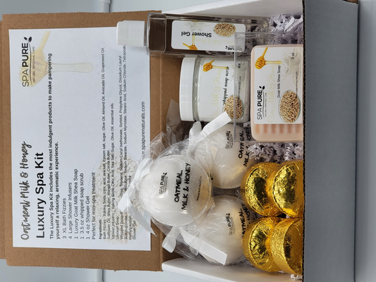 Spa Pure Luxury Spa Kit = Oatmeal, Milk & Honey, Gift for Her, Pampering Gift Set, Bath Fizzies, Shower Steamers, Whipped Soap Scrub, Shower gel