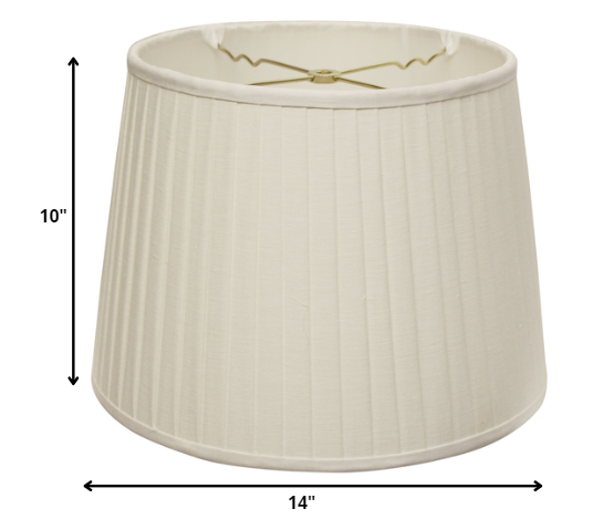 This 14" White Paperback Linen Lampshade with Side Pleats has a hint of mid-century modern flair and will be a great addition to your lamp base. This slant empire linen side pleat softback lampshade includes a standard washer fitter that fits over a standard harp and can be used with your existing finial design. This high quality crafted drum shape has a slight slant to give it some visual interest and is crafted of the finest high-quality linen weave with a fold on top and bottom of the shade. 10" x 14" x 14"