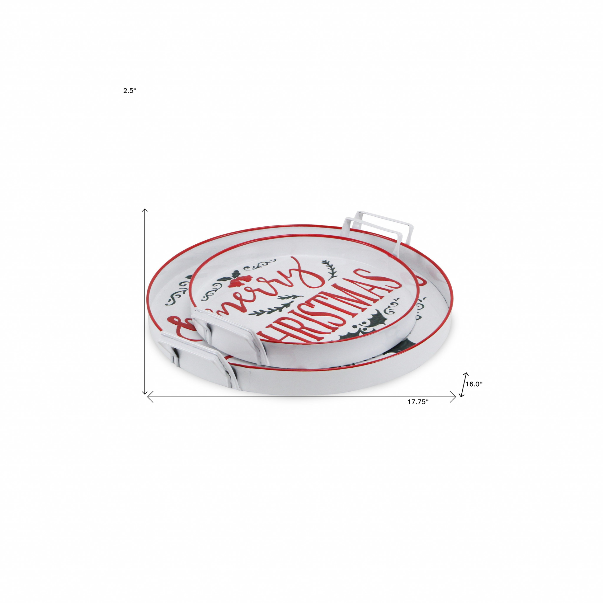 This 18" white round metal christmas handmade tray with handles is a handy and versatile addition to your home. Crafted from sturdy and durable metal, this round tray is versatile enough to blend with a variety of color palettes and aesthetics. Features handles for quick and easy transportation. This tray has a food safe finish. 2.5" H x 17.75" W x 16" D