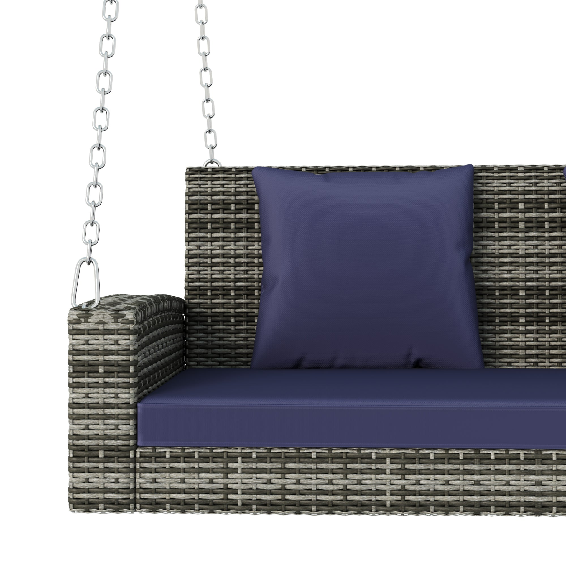 2-Person Wicker Hanging Porch Swing with Chains, Cushion, Pillow, Rattan Swing Bench for Garden, Backyard, Pond. (Gray Wicker, Blue Cushion)