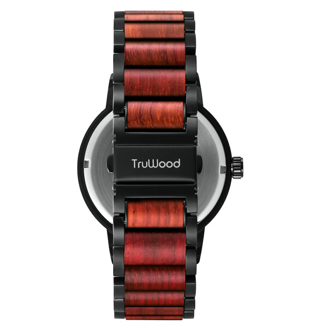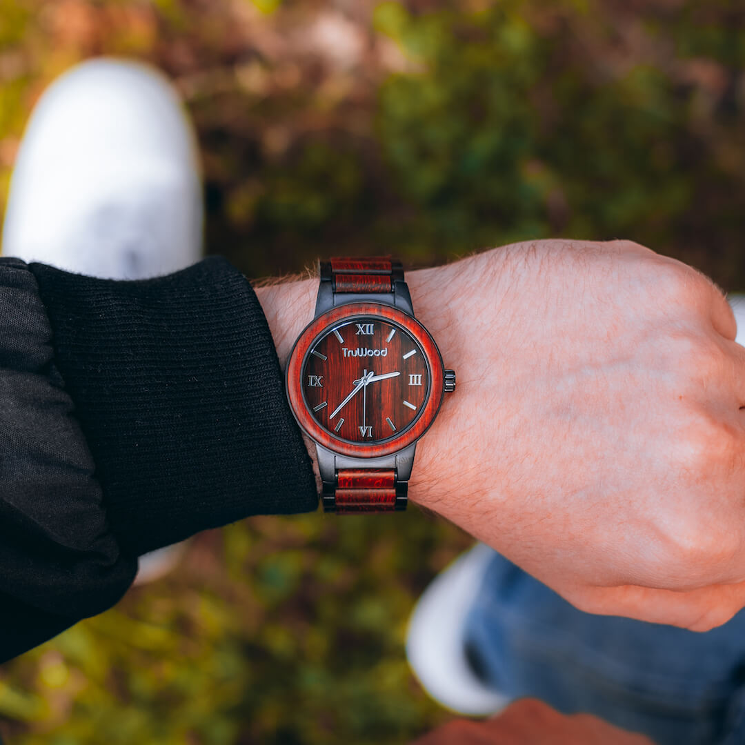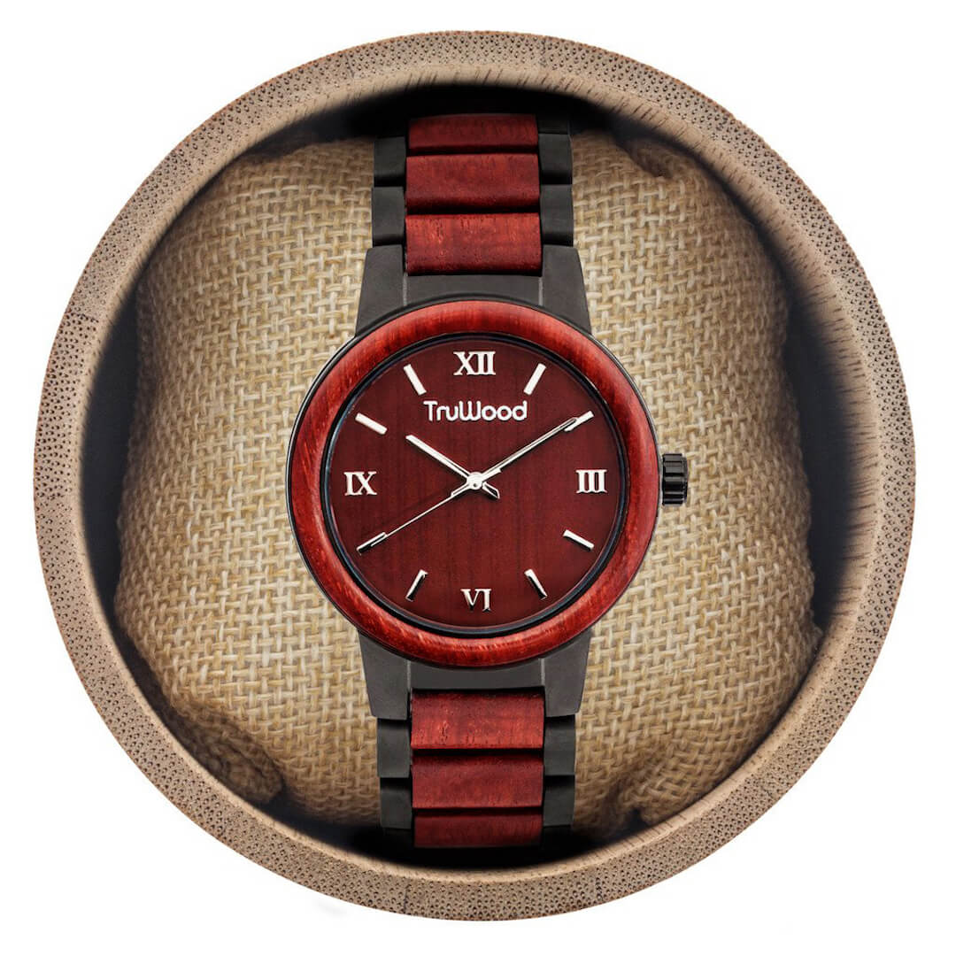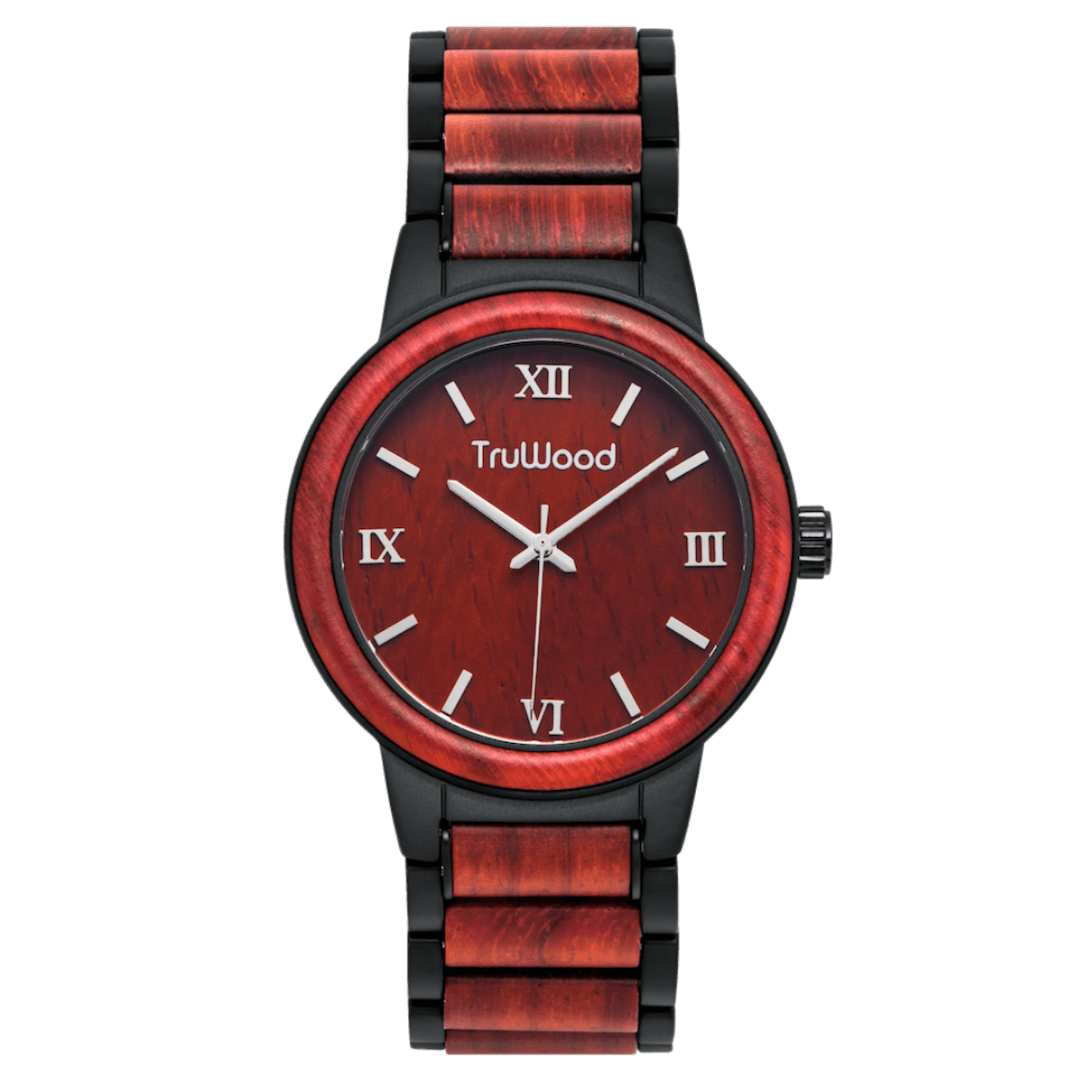 The Architect features a stainless steel case with a stunning matte black polish. A deep red sandalwood around the bezel and dial face compliments the dark metal finish resulting in a watch that exudes class. Roman numerals stand proud in a sapphire coated crystal glass, held together by a metal and redwood link band to complete the package. With each hand picked grain of wood being unique, the Architect is perfect for the wearer who wants to set themselves apart from the crowd.