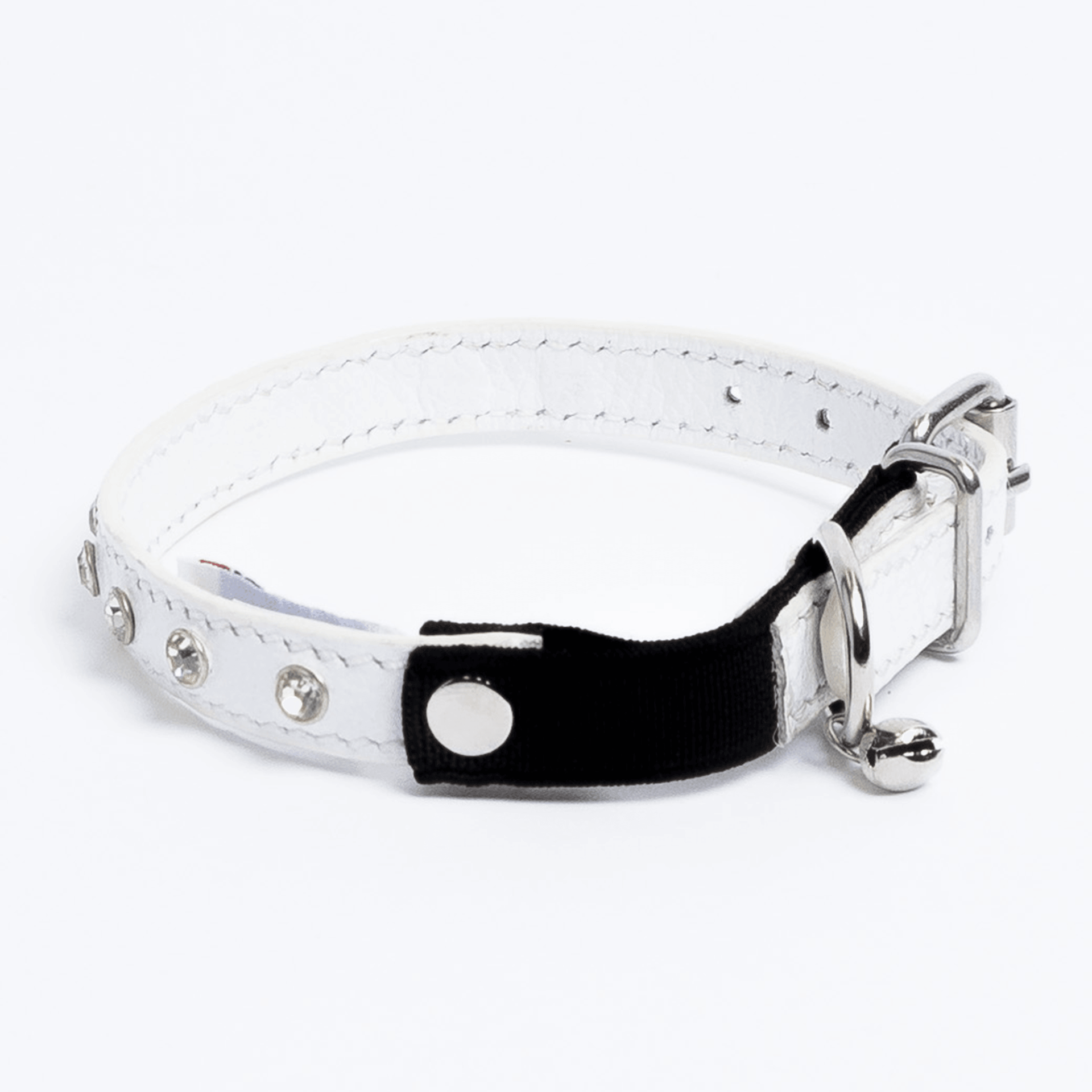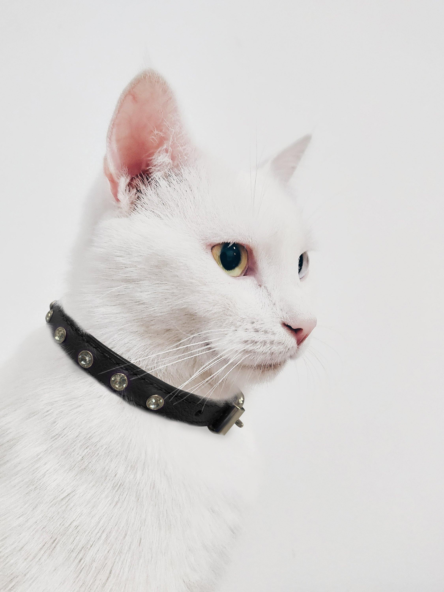 Your cat will make a serious impression with these gorgeous rhinestone collars. Available in 6 colors and 2 sizes, these collars include the elastic break- away and bell as safety features. Made of 100% genuine leather, these lightweight cat collars are soft and comfortable. The stones are securely fastened and guaranteed not to fall. We hate to say it but tiny dog breeds love these these collars too.