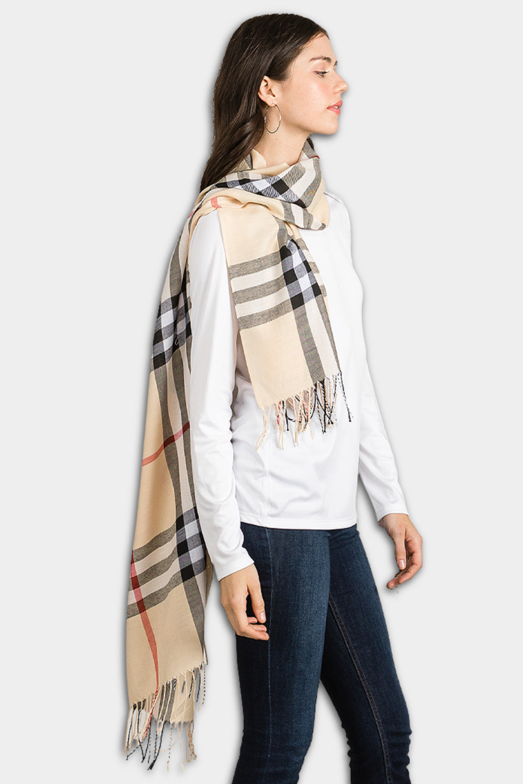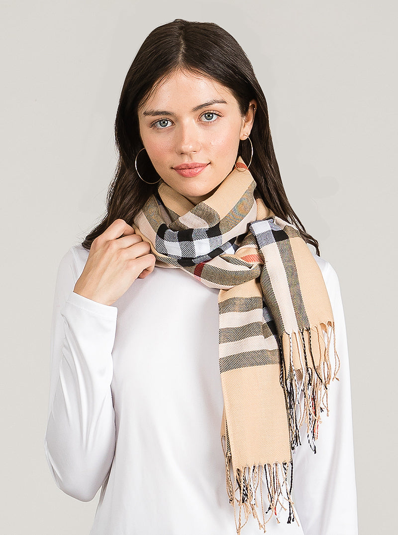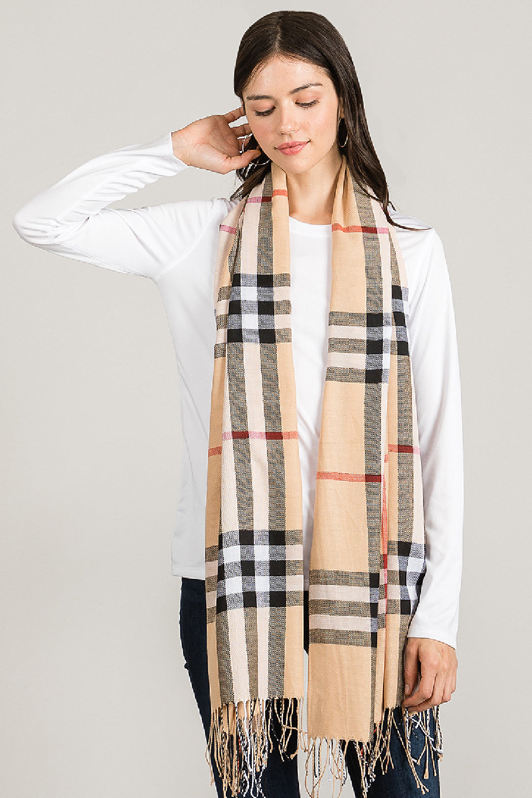 Pashmina scarf in a designer beige plaid. The weight and feel of this scarf is ideal for year round wear. 60" x 170".