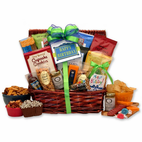 The perfect gift for him on his birthday this year! We've selected delicious goodies he is sure to enjoy like Bavaria sausage, cheddar cheese, Cajun pretzels and more. The perfect combination of sweet and salty to satisfy his taste buds on his special day. Gift includes:13" dark stain hamper with lid, chocolate cupcake cookies with sprinkles, 3 oz Bavaria sausage, grained mustard, honey sweet peanuts 3 oz., zesty cheddar cheese bar, Boulder Creek kettle chips BBQ flavor, Boulder Creek kettle chips Sea Salt, Food Should Taste Good Blue Tortilla Chips 1.75 oz, East Shore Cajun pretzels 4 oz, Kind Dark Chocolate Cherry Cashew Bar 1.4 oz, Royal Deluxe Mixed Nuts 4 oz, Happy Birthday Gift card. Completed gift measures 13" long by 8" wide by 14" tall is wrapped in cellophane and topped with a hand made bow. Completed gift measures 4 pounds.