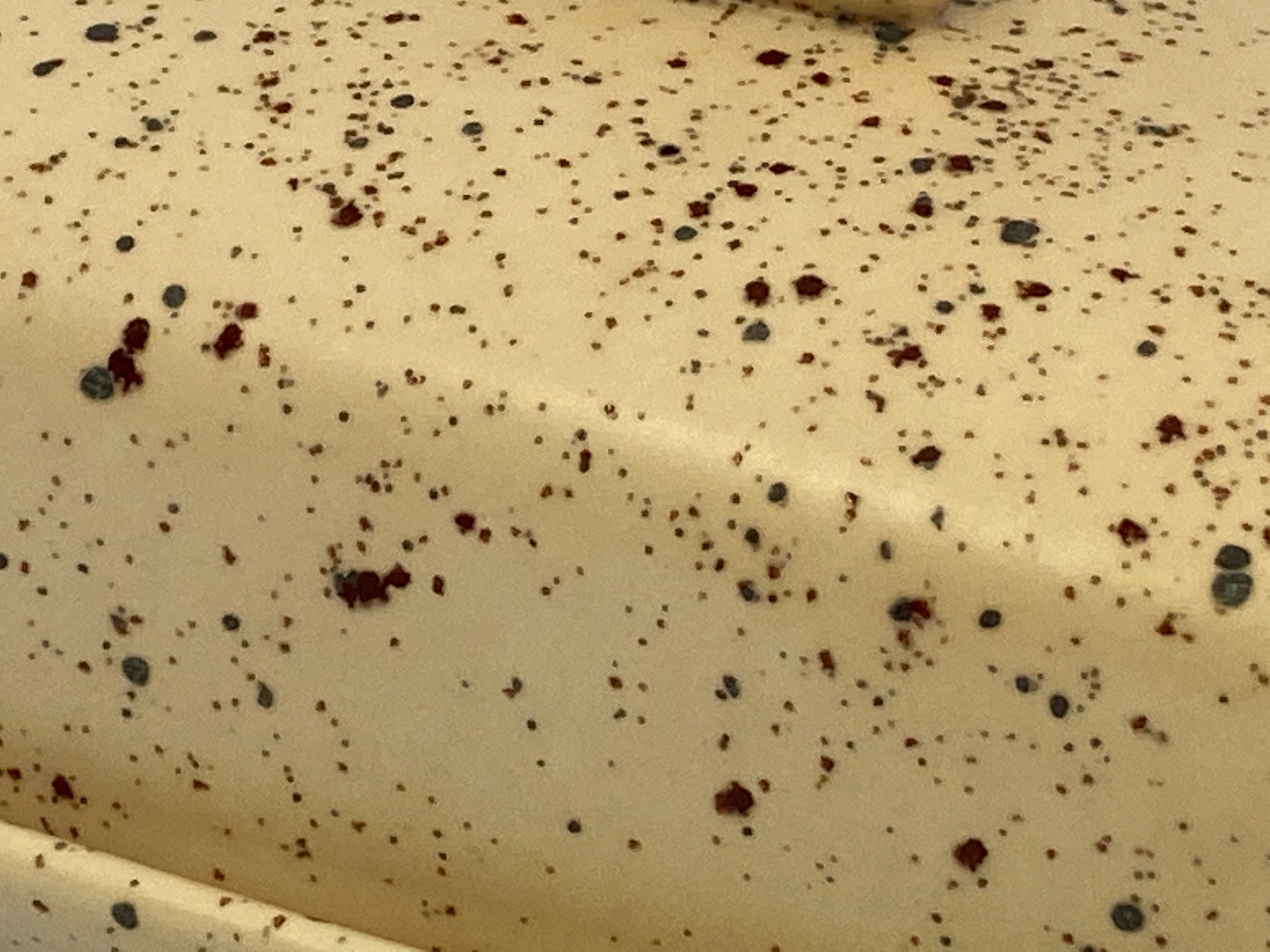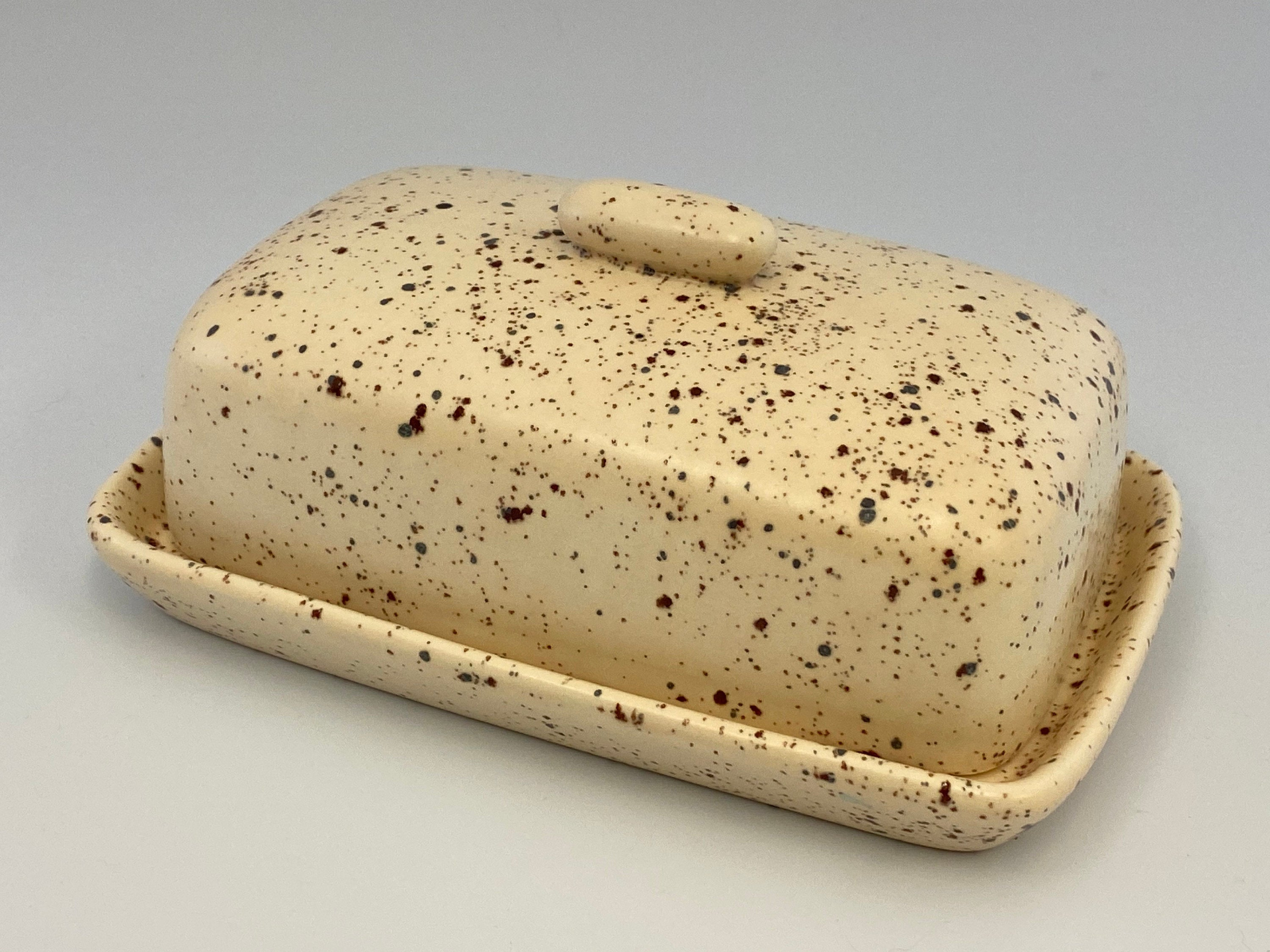 Butter dish, sugar bowl and milk jug in a new speckled cream glaze is earthenware pottery.