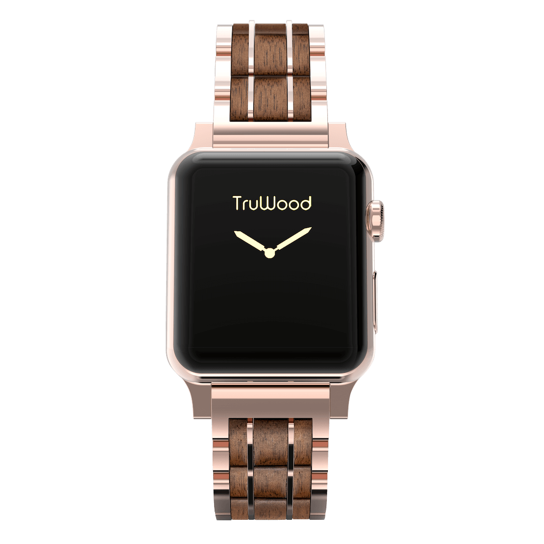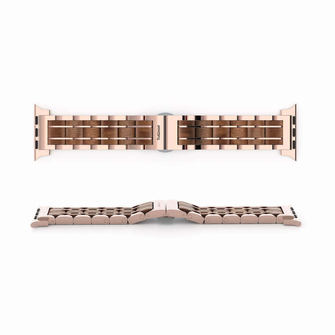 Every one of our Classic Apple Watch Bands are unique. Made with 100% natural walnut wood and rose gold plated stainless steel with custom stainless steel lug end adaptors. Compatible with all series of Apple Watches, up to Series 8 and Apple Watch Ultra (case sizes 38mm, 40mm, 41mm, 42mm, 44mm, 45mm and 49mm).