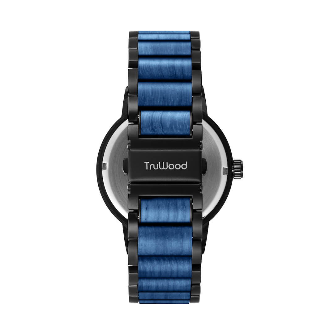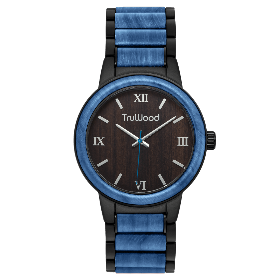 The Coast features a stainless steel case with a stunning matte black polish. Blue dyed maple wood around the bezel and a black sandalwood dial compliments the dark metal finish for a watch that really pops. Roman numerals stand proud in a sapphire coated crystal glass, held together by a metal and blue maple link band to complete the package. With each hand picked grain of wood being unique, the Coast is perfect for the wearer who wants to set themselves apart from the crowd.