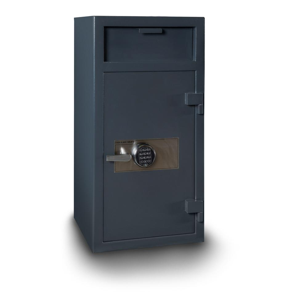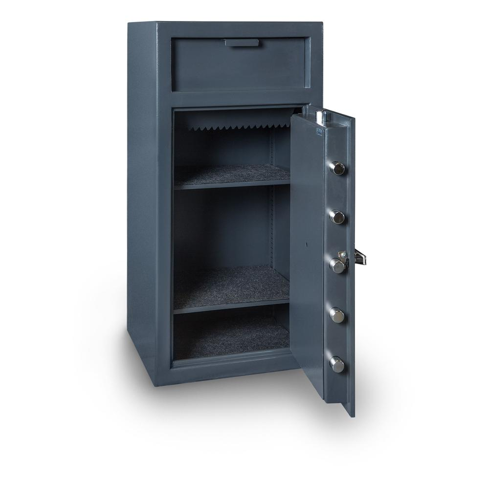 B-Rated Heavy Duty Depository Safe (5) 1.20" chrome plated steel bolts. Internal re-locking devise provides secondary line of defense. 4 pre-drilled anchor holes. Anti-Fish baffle prevents theft through deposit door.