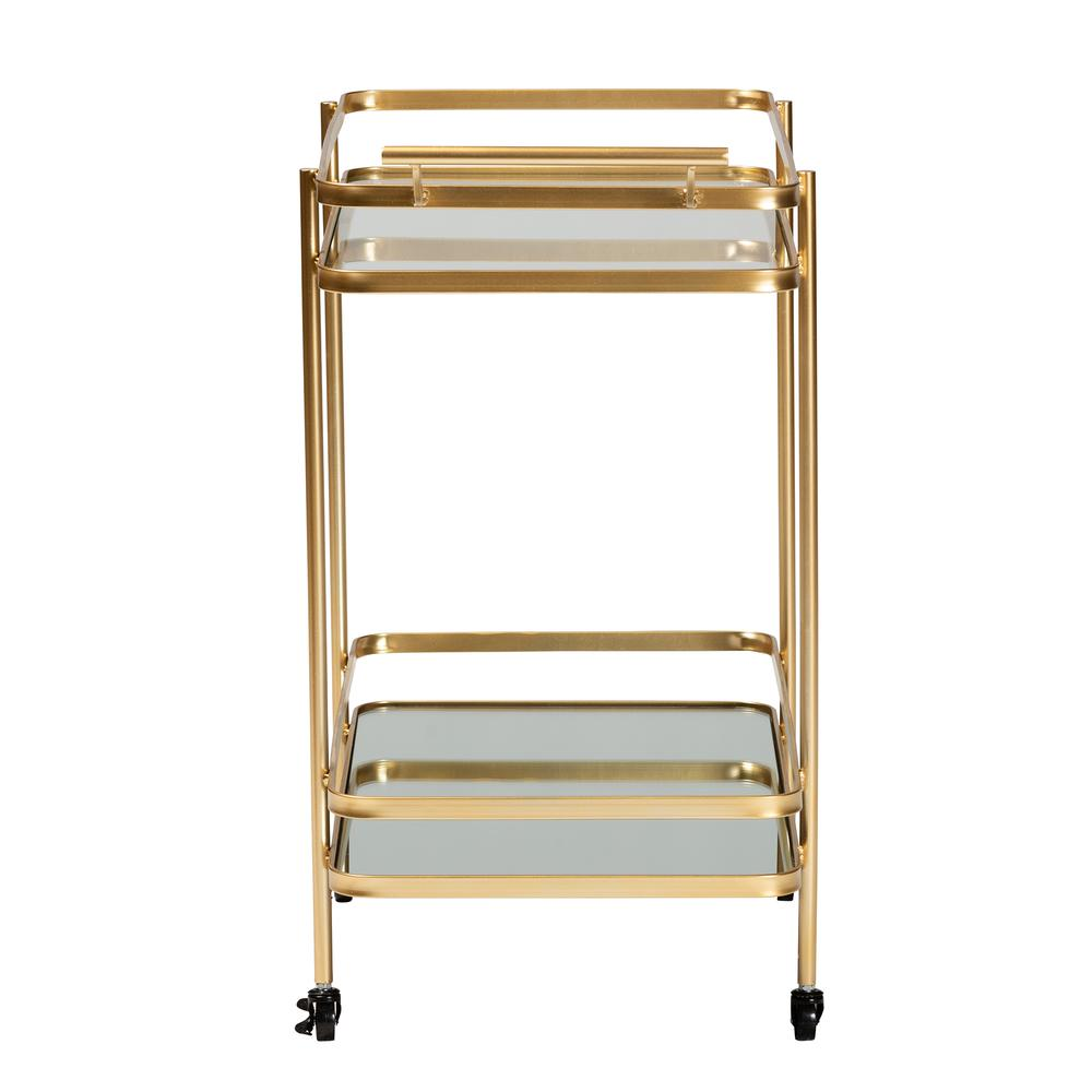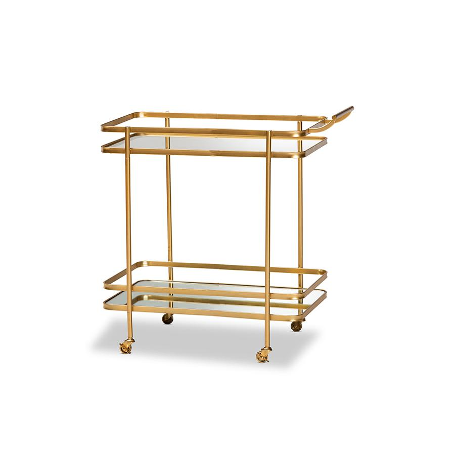 Destin Modern and Contemporary Glam Brushed Gold Finished Metal and Mirrored Glass 2-Tier Mobile Wine Bar Cart