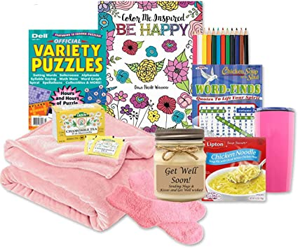Don't Worry - Be Happy Get Well Gifts For Women with ultra soft blanket, cozy socks, the perfect way to show her you are thinking of her when she is feeling down, under the weather or just plain blue. We created this exclusive gift well gift basket for women with only her in mind. From the ultra soft plush blanket to the warm & cozy socks she'll truly feel special & cared for when she receives this thoughtful get well gift. This get well gift for women includes: 50x60 soft blanket, warm and cozy fuzzy socks, Chamomile socks, Lipton chicken noodle soup, Chicken Noodle soup for the soul inspirational word finds, Variety puzzle book with over 50 pages of entertaining and unique puzzles, Our exclusive Be Happy adult coloring book with over 75 pages of de-stressing beautiful pages to color, artists colored pencils in a 12 pc set, our custom hand poured 6 oz Get well soon cashmere vanilla aromatherapy candle,Travel Mug.