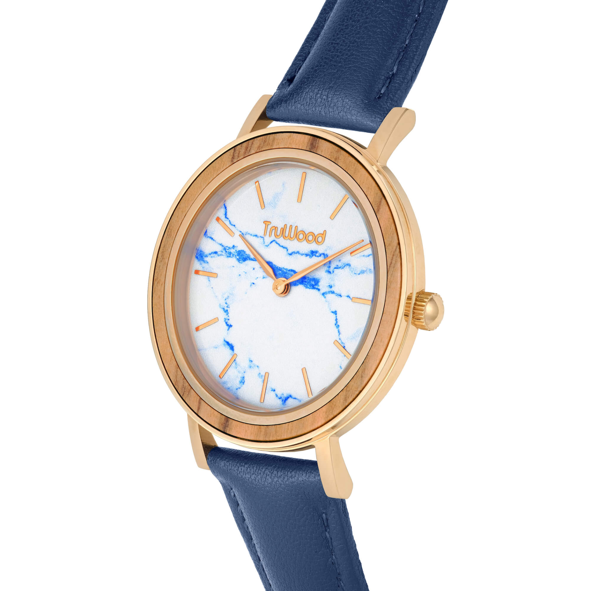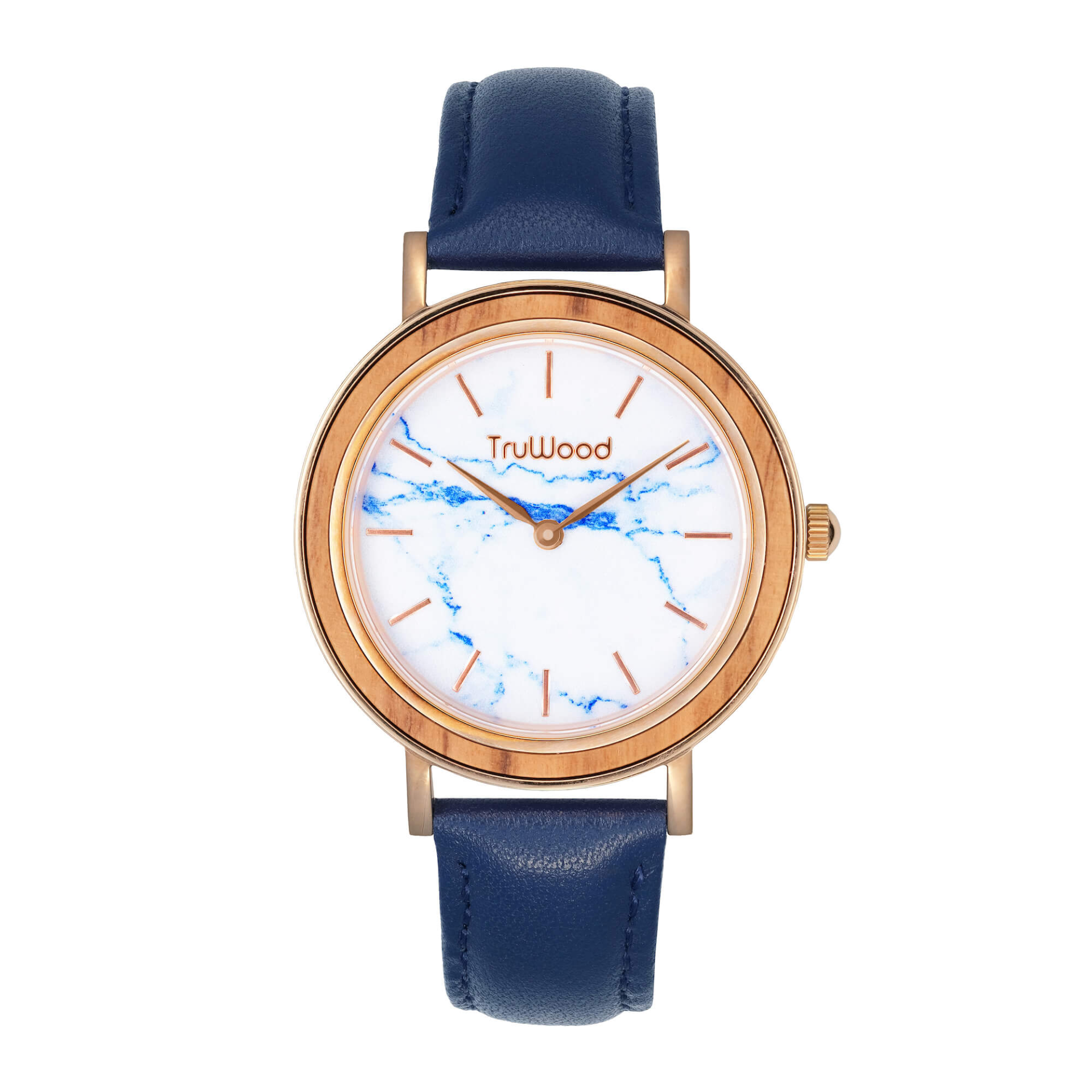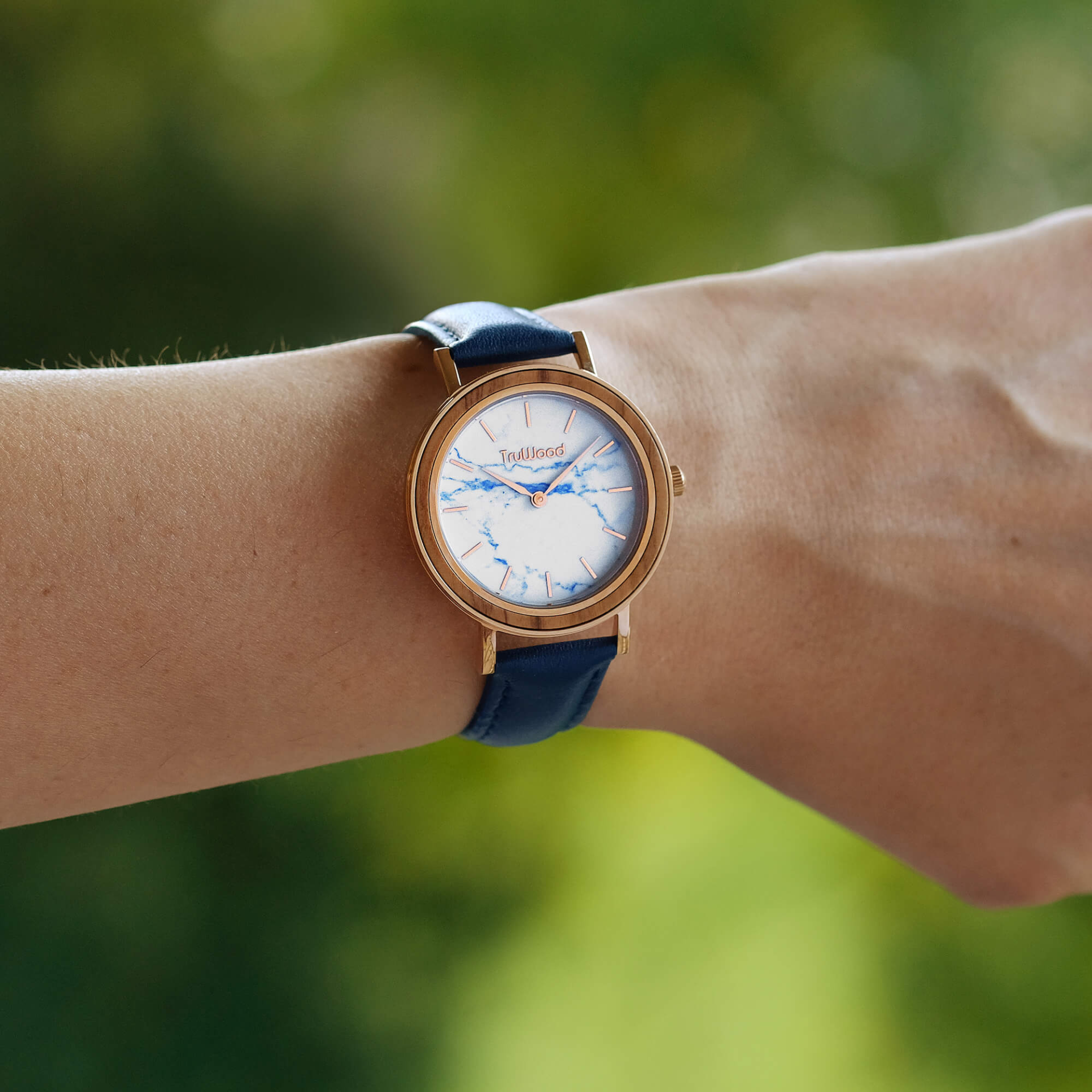 Our Marble & Wood collection is back, better than ever. Redesigned from the ground up into a staple watch for women, the Dover is more than just a timepiece. The white marble enamel dial with blue streaks creates a delicate look within our signature olive wood bezel. Crafted in a brushed rose gold stainless steel case and held together by a chic and stylish leather band, the Dover captures your individuality like no other.