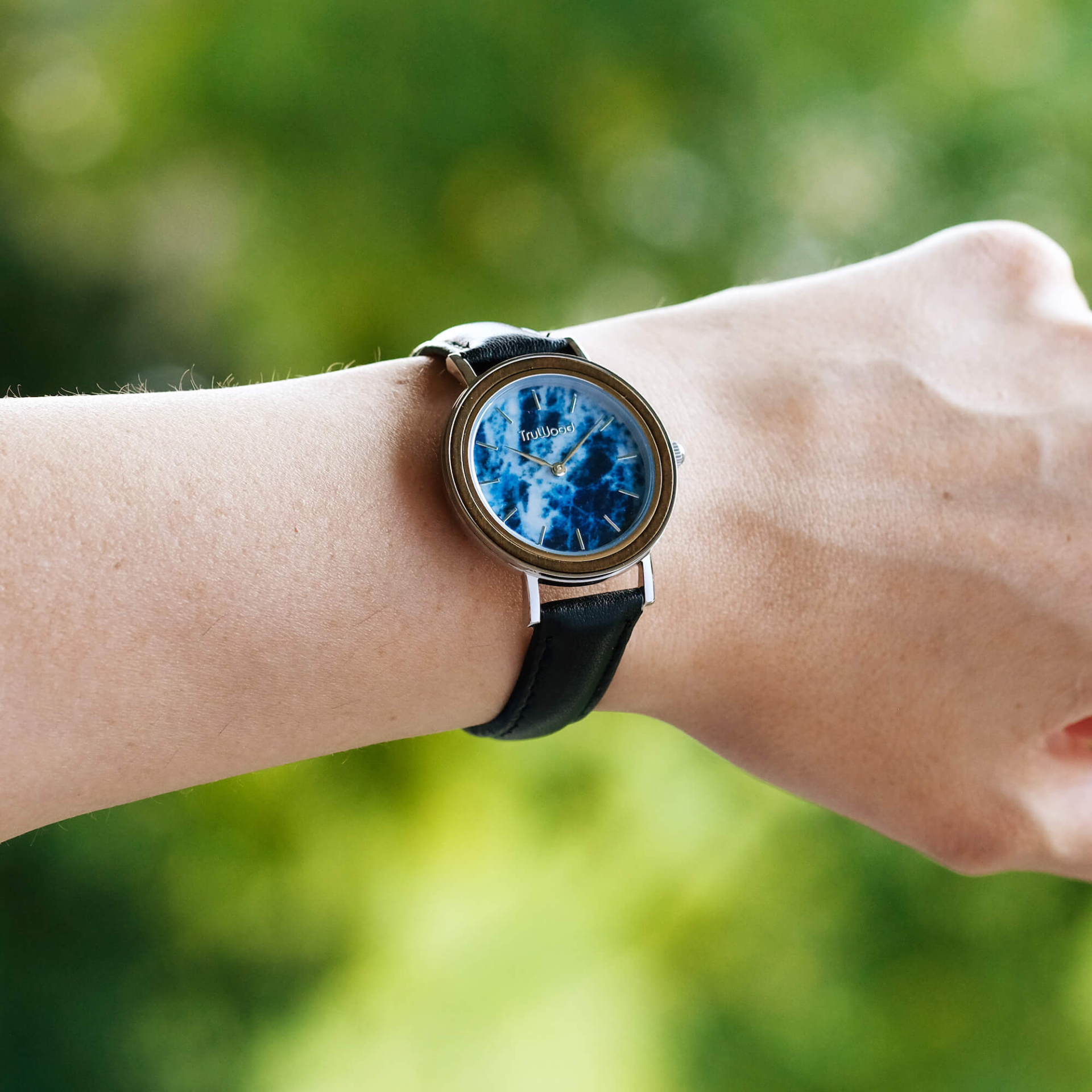 Our Marble & Wood collection is back, better than ever. Redesigned from the ground up into a staple watch for women, the Earth Women's is more than just a timepiece. The blue marble enamel dial creates a delicate look within our signature black sandalwood bezel. Crafted in a brushed silver stainless steel case and held together by a chic and stylish leather band, the Earth Women's captures your individuality like no other.