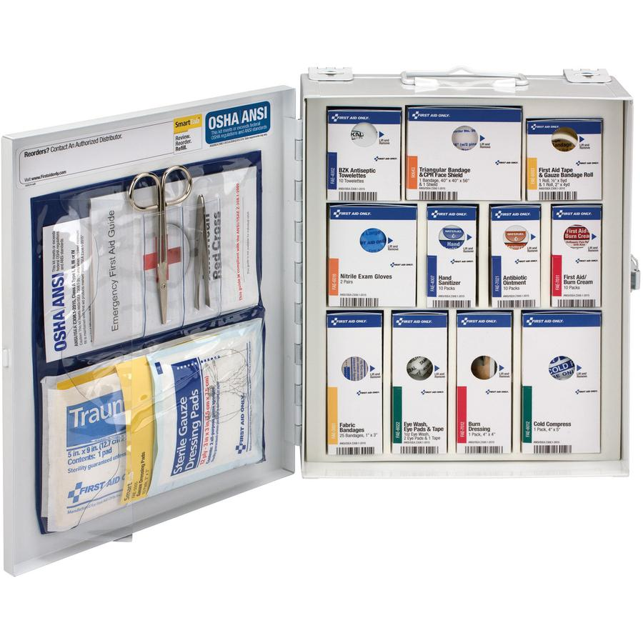 Class A SmartCompliance First Aid Cabinet without medications sufficiently treats 25 or more people. Customizable cabinet is easy to use, easy to restock and eliminates disorganized supplies. Solid steel case features a carrying handle for quick, simple transportation to the injured person. Plus, the case is wall-mountable to keep it conveniently displayed in an easy-to-access location. First aid contents exceed the 2021 ANSI Class A requirements. Type 1 and 2 first aid kit includes triangular bandage, CPR mask, first aid guide, fabric bandages, BZK antiseptic towelettes, hand sanitizer packets, trauma pads, cold pack, nitrile exam gloves, eye pads, eyewash, tape roll, first aid tape, burn cream packets, burn dressing, antibiotic ointment packets, forceps, scissors and a 52" x 84" foil blanket.