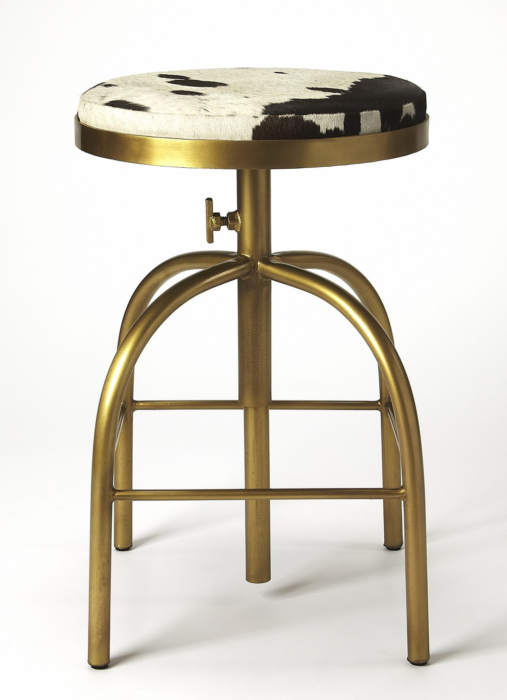 Ideal for your rustic home decor or pair it along your vanity table, the Hair on Hide Leather Bar Stool is a vision in gold. Versatile in essence it adds a touch of character to any style or set up. This bar stool comprises of four strong angled legs surrounded by a square iron frame footrest, attached to a threaded column shaft which allows you to modify the height to your preference. The natural pattern on the hair on hide leather seating adds to the uniqueness of this piece while the gold iron plated finish allows it to fit into any vintage decor. 26" x 16.5" x 16.5"
