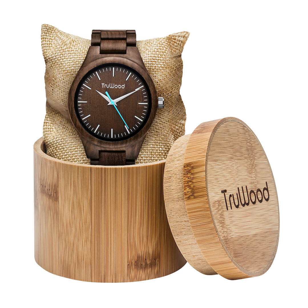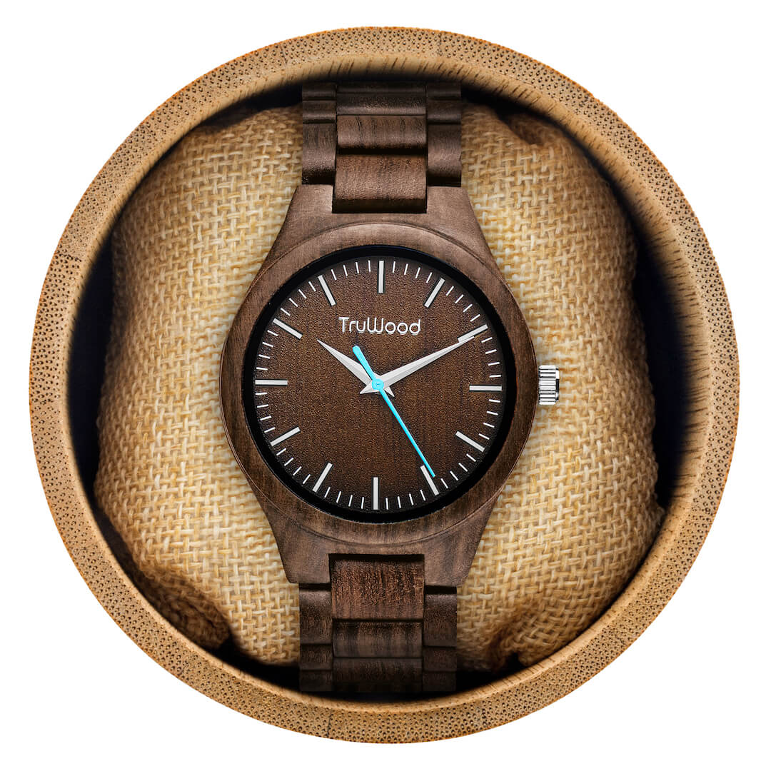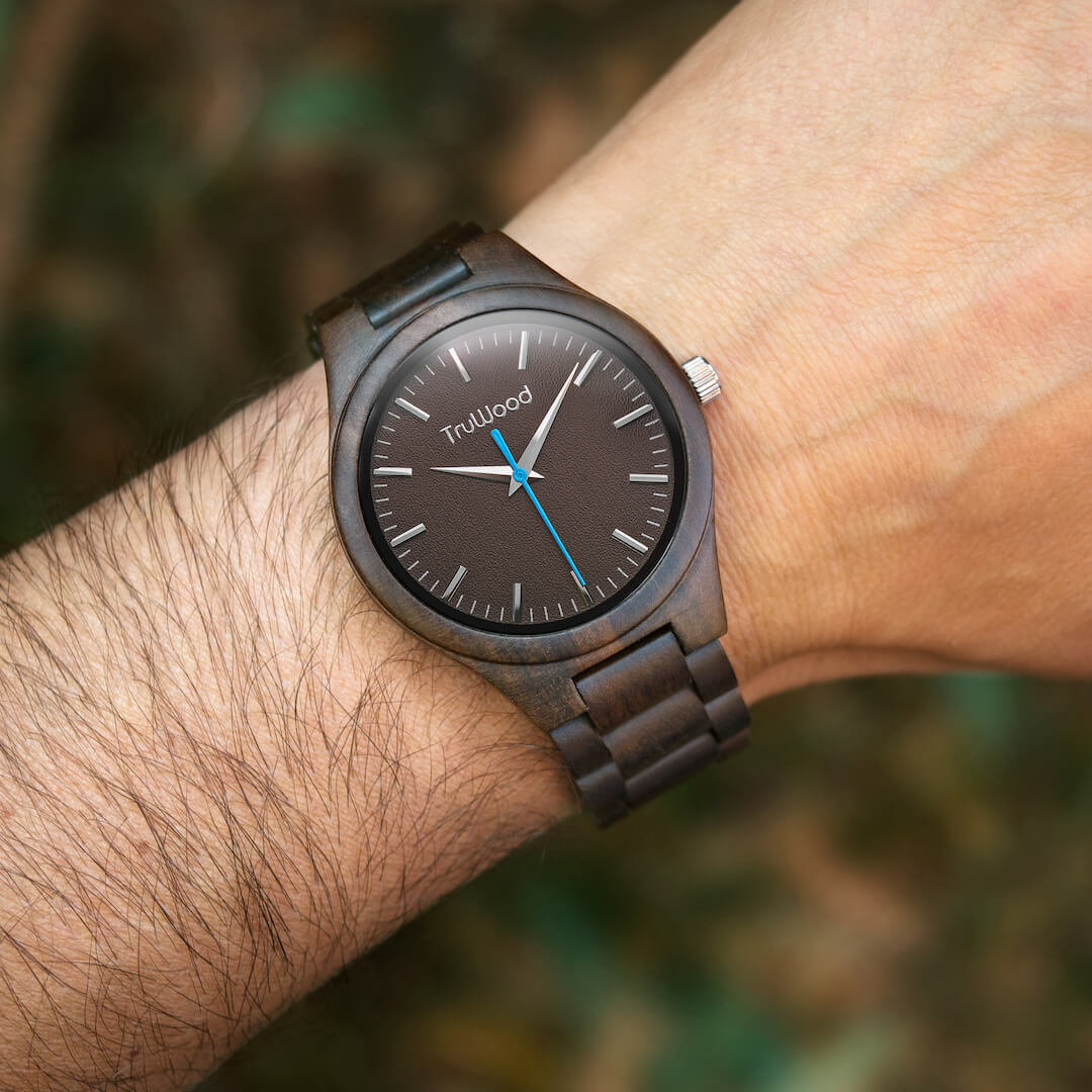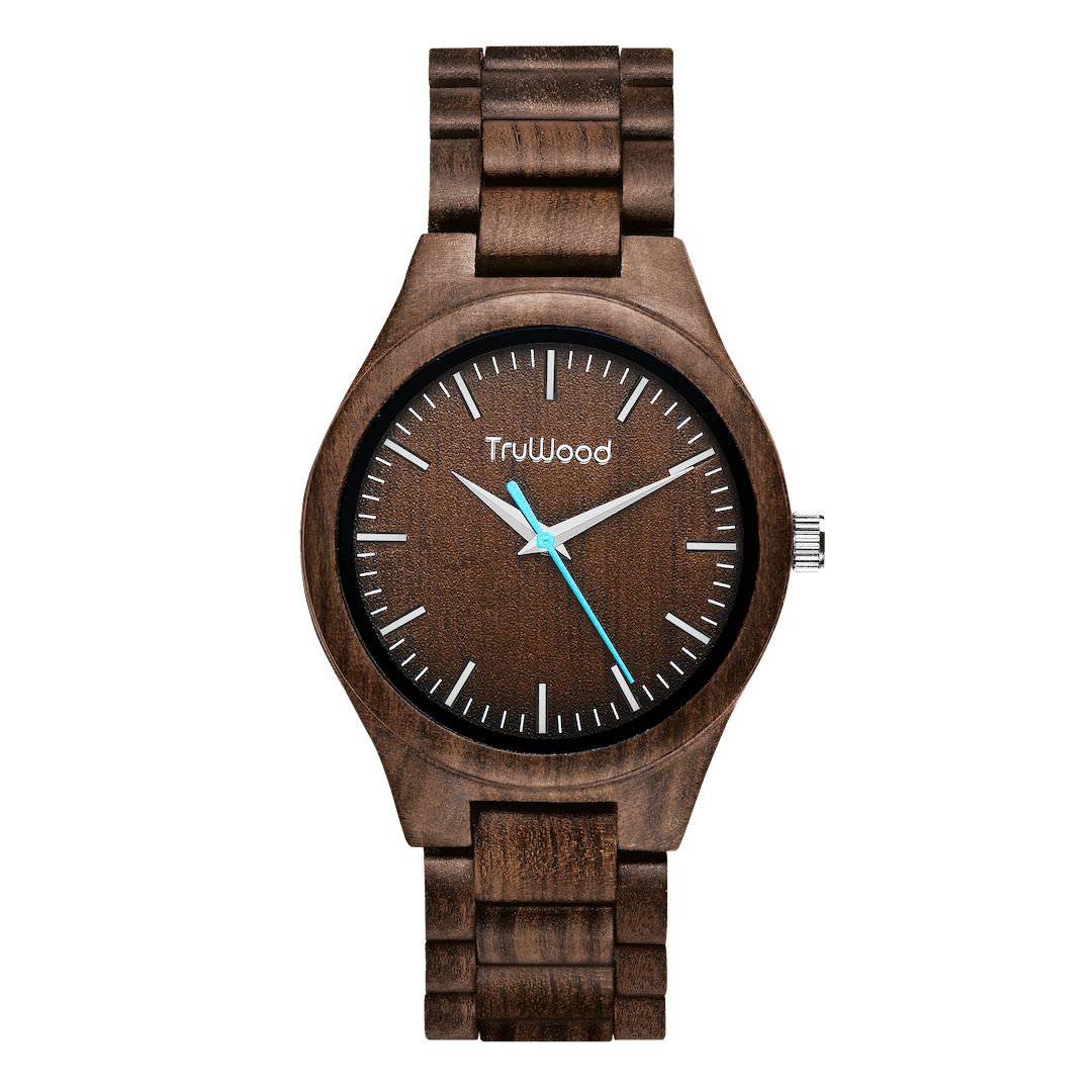 Everyday elegance has never been so accurate a description for any timepiece. The TruWood Hawk, our most celebrated watch is handcrafted by expert watchmakers, built on excellence and never cutting corners. The black sandalwood case is polished to ensure a uniform grain and specially cured for water resistance in a stunning slim profile. A sky blue second hand on a dark brown dial housed in a sapphire coated crystal glass provides the perfect bridge between bold and simplicity. The lightweight dark wooden links complete the Hawk as your most comfortable watch ever.