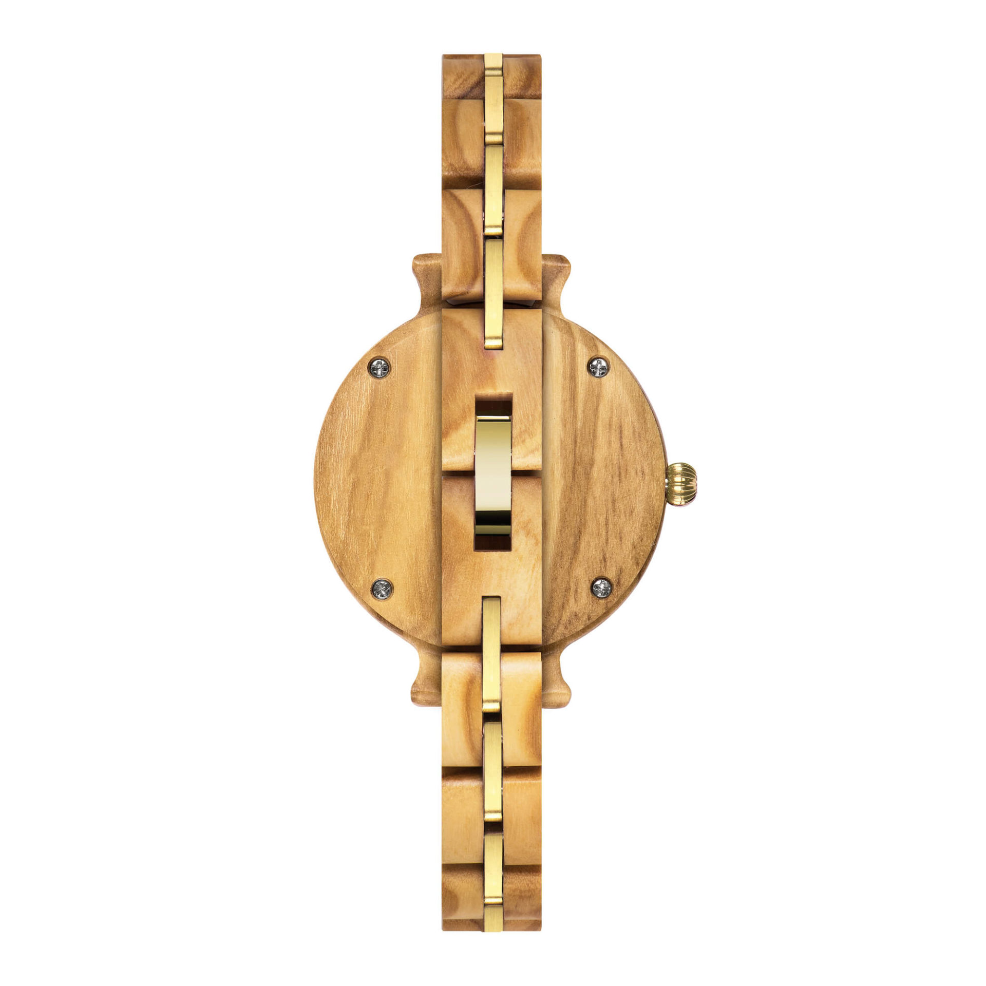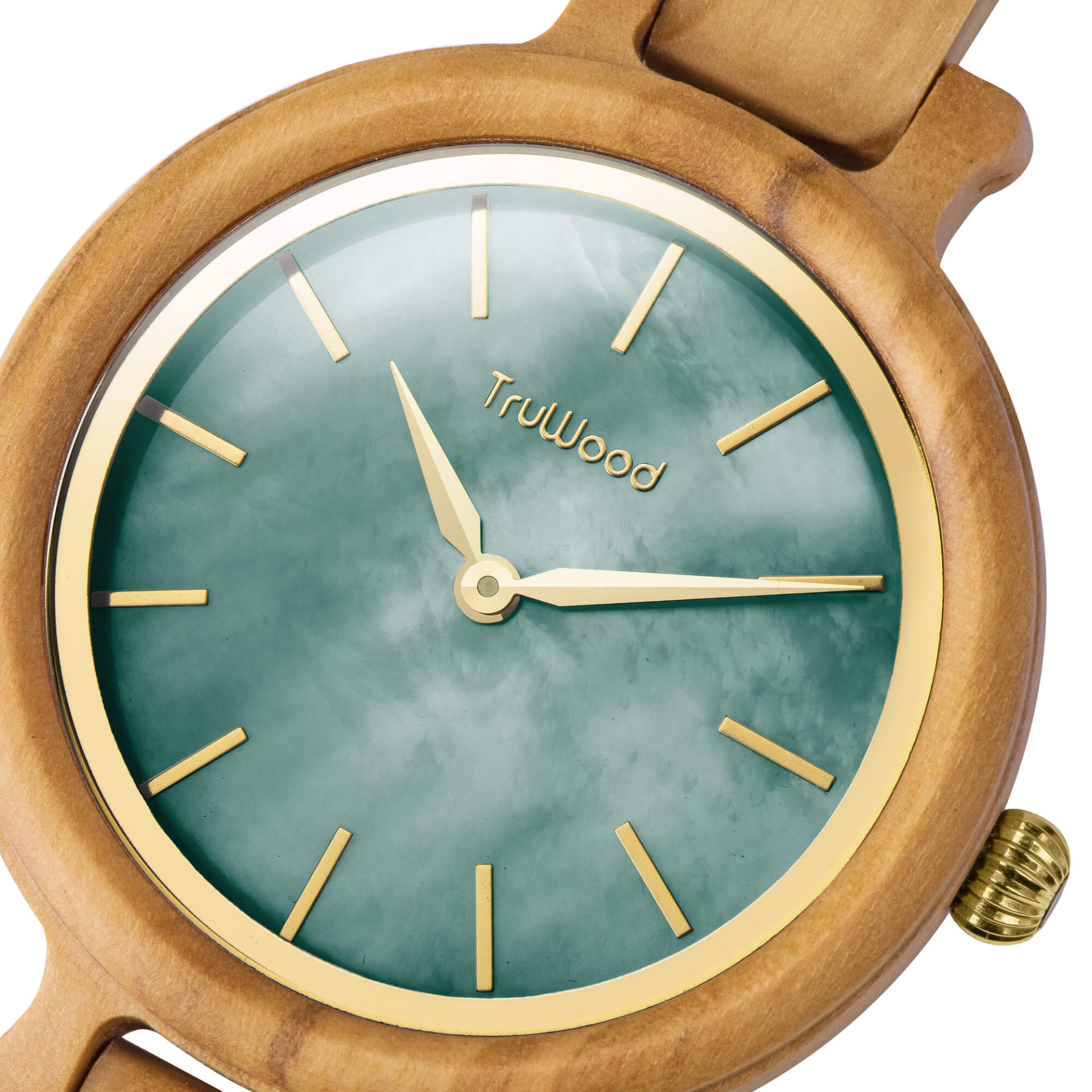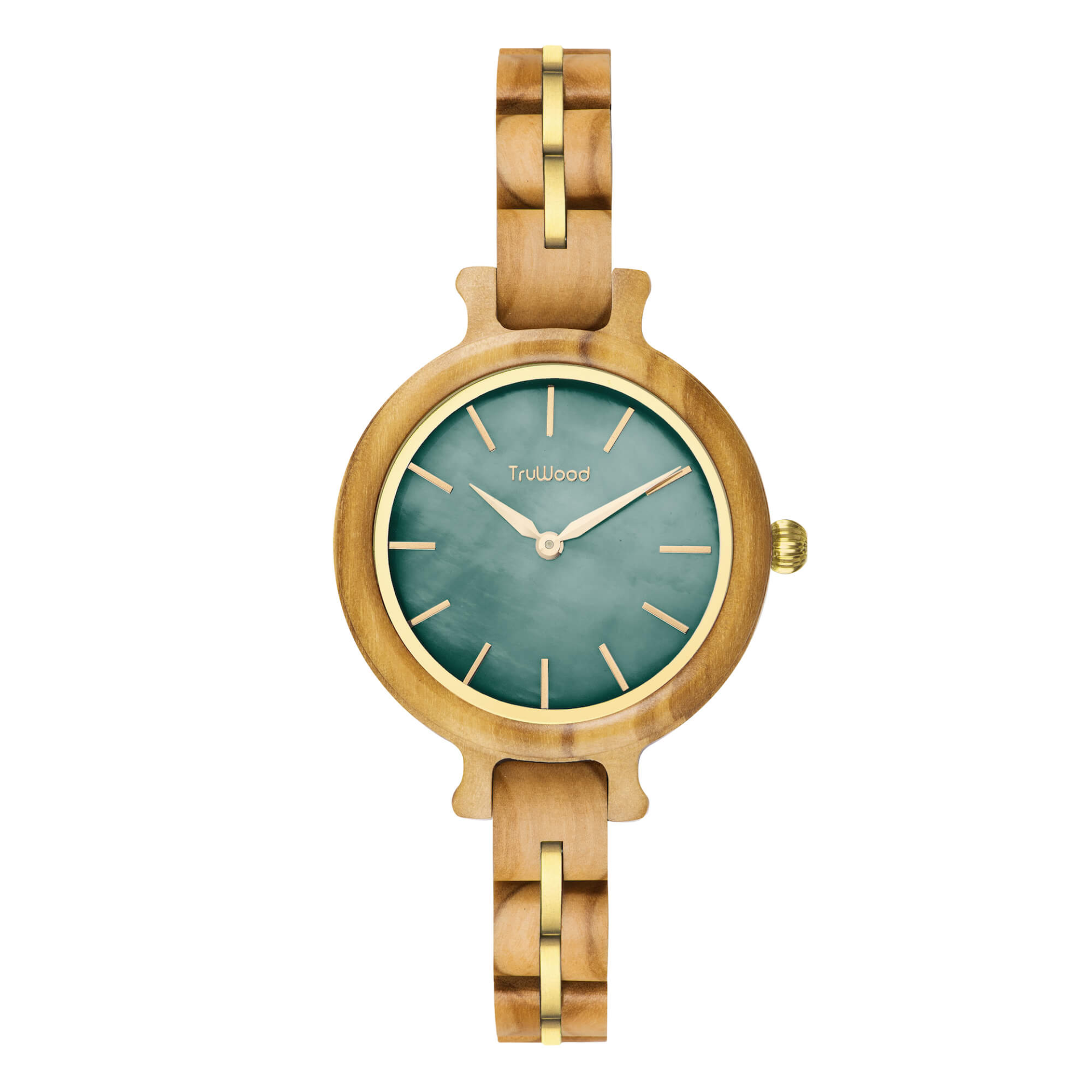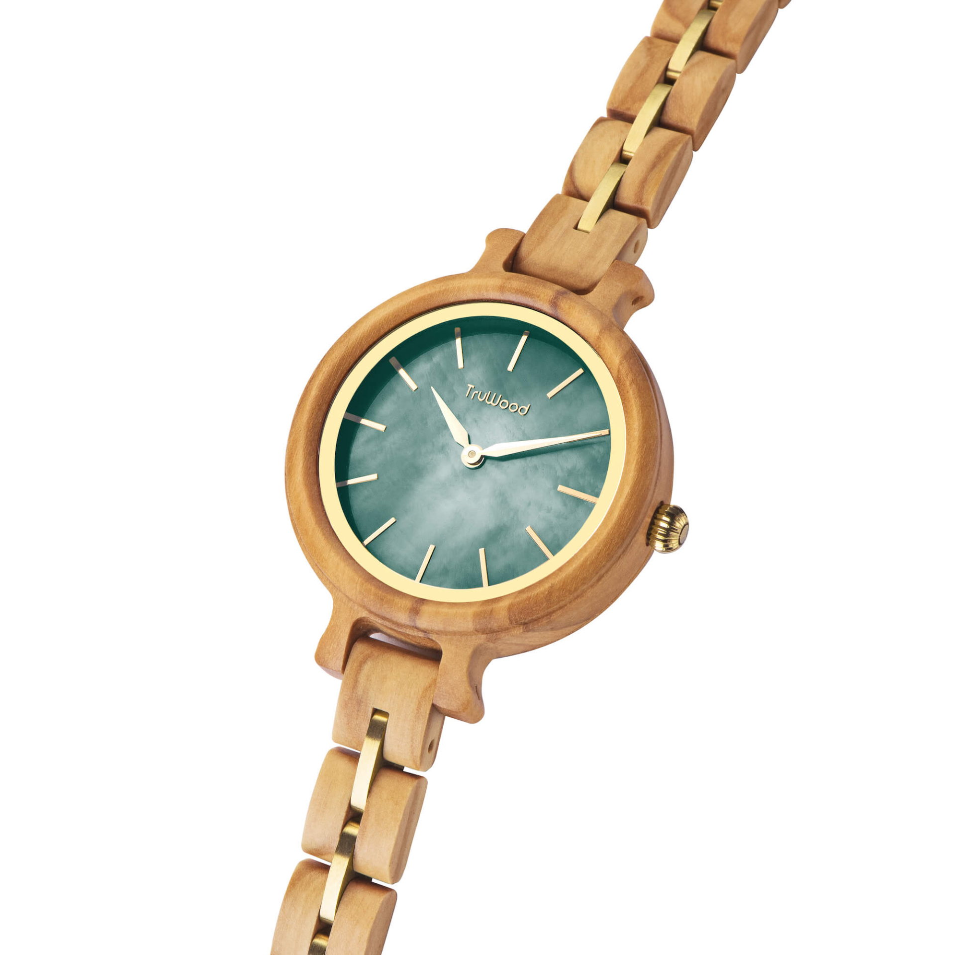 Belle is French for “beautiful", which this collection is rightfully named after. Some watches are meant to be practical, used everyday, nothing stylish. This is where we beg to differ! Practical and trendy do not have to be mutually exclusive, and the TruWood Jade is proof. This trendy watch is made with a perfect combination of brown olive wood and a green pearl dial with gold markings, giving it an unmistakable look that is the perfect marriage of luxury and practicality. Truly a dream watch for any fashionista.