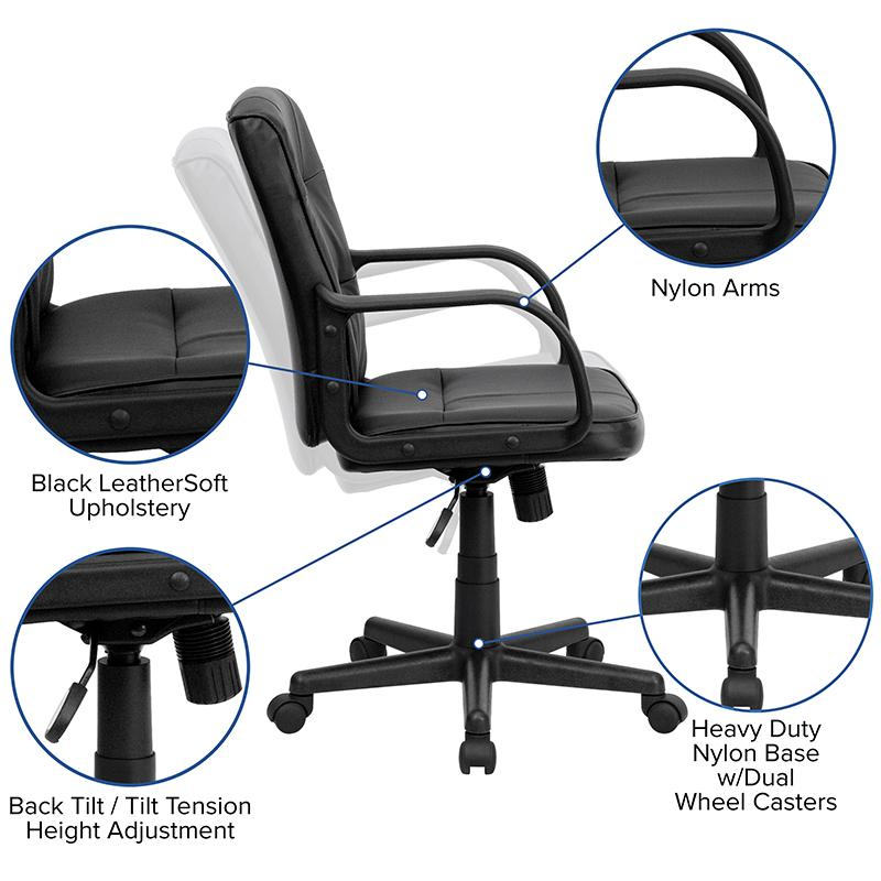 Contemporary Office Chair with Arms 250 lb. Weight Capacity Black LeatherSoft Upholstery Mid-Back Design, Padded Arms Tilt Lock Mechanism rocks/tilts the chair and locks in an upright position, Tilt Tension Adjustment Knob adjusts the chair's backward tilt resistance CAL 117 Fire Retardant Foam Pneumatic Swivel Seat Height Adjustment Heavy Duty Nylon Base Dual Wheel Casters LeatherSoft is leather and polyurethane for added Softness and Durability