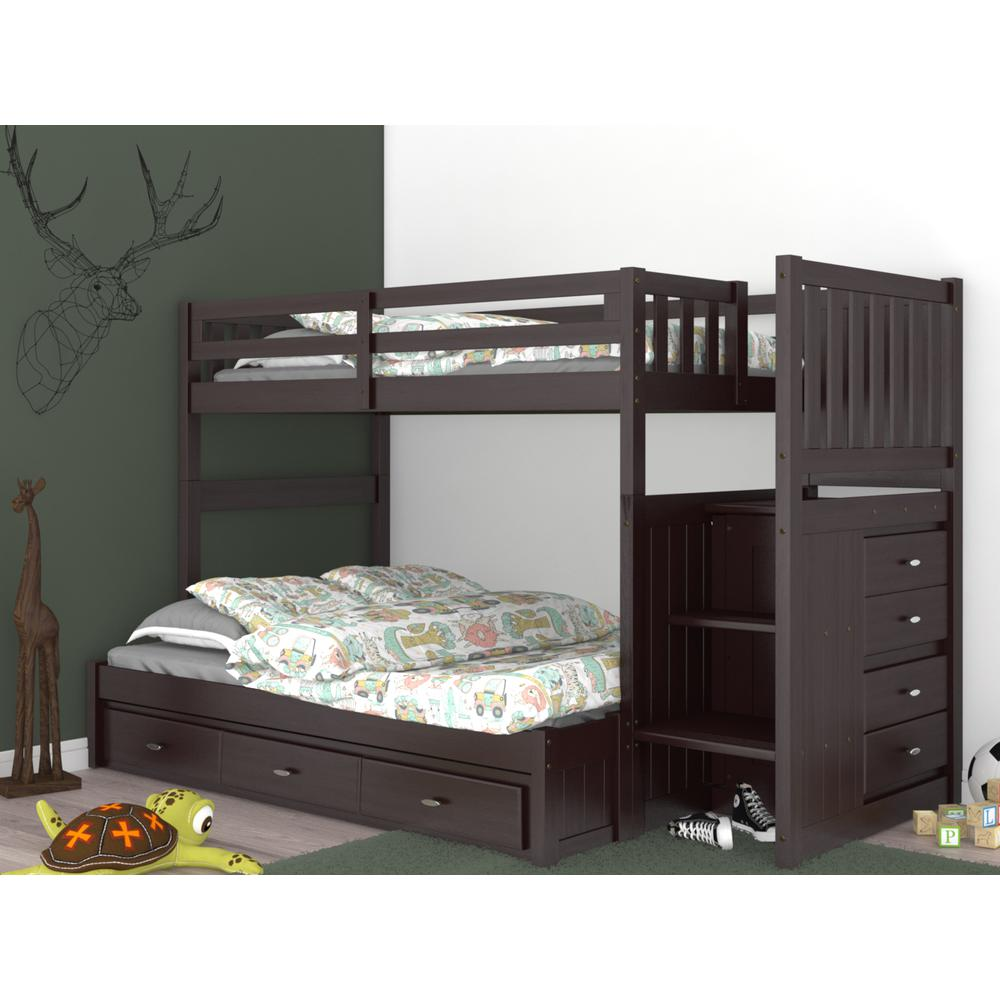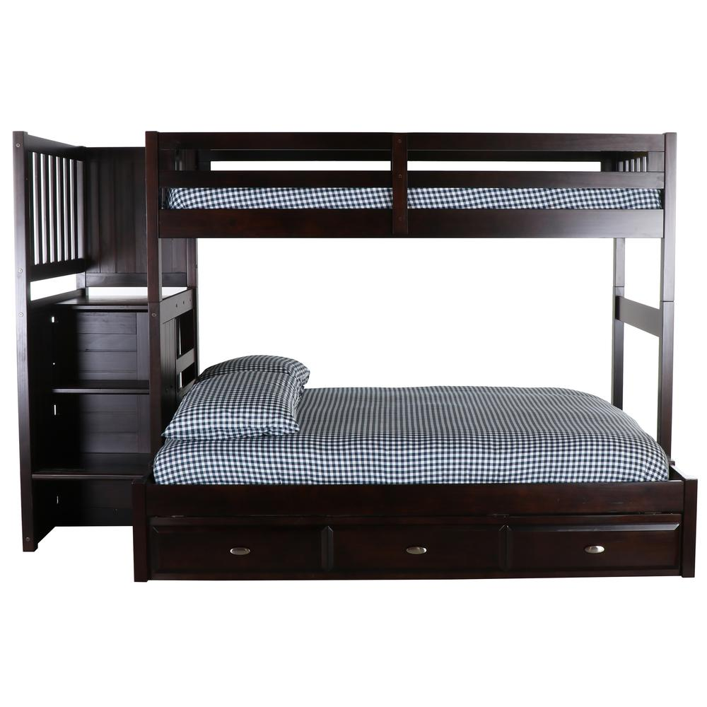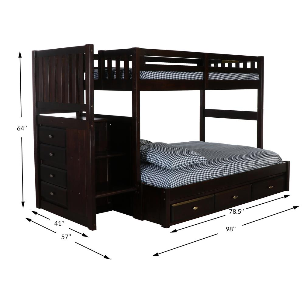 Add style to your children's bedroom with this twin over full staircase bunk bed in a dark espresso finish! The ready-to-assemble unit features a built-in, four-drawer chest and reversible staircase, magazine rack, and three-drawer under-bed storage unit. The stair treads are 17.25" wide for a safe climb to the upper bunk. Quality, solid-wood construction makes this bunk bed a great buy.