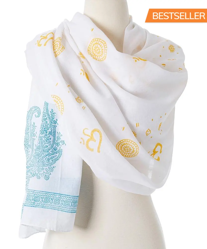 This beautiful Om Shanti shawl is hand block printed on peaceful and luxurious white fabric with a traditional paisley design, universal mantra OM, and other divine symbols that preserve tradition in style. OM represents the beginning and end of creation.
