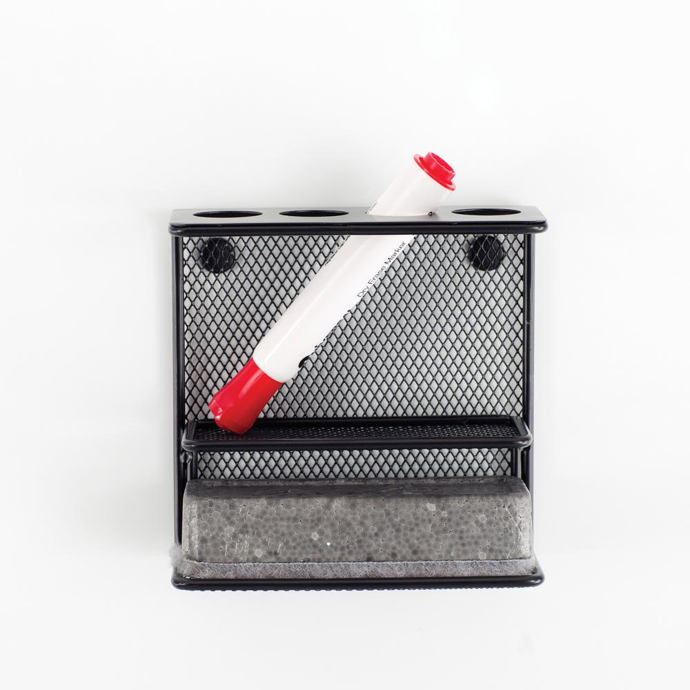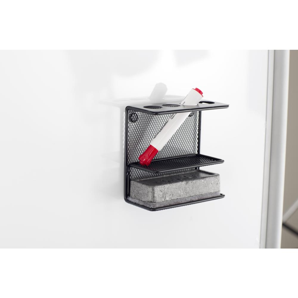 Magnetic whiteboard accessory for dry erase marker and eraser storage Includes 4 stand-up marker holders that fit most standard whiteboard dry erase markers Individual marker holder openings make it easy to grab a marker when needed and keep markers upside down so they last longer 5" W shelf for storing marker board eraser Magnetic back allows for use on whiteboard or any other magnetic surface; Features Rare Earth Magnets strong enough to work on Magnetic Glass Marker Boards as well as standard magnetic whiteboards Caddy can also be mounted to wall with use of steel plate (included) Steel wire mesh construction with scratch-resistant, Black powder coat finish Rolled edges are smooth to the touch and give a polished appearance