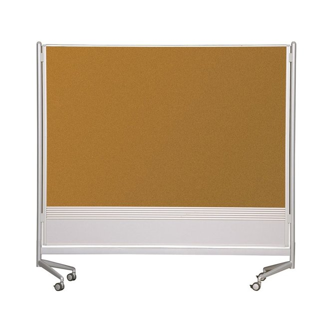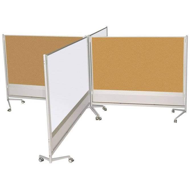 Versatile and multifunctional, D.O.C. Partitions allow you to divide, organize, and customize a work or display area however you choose. • Mobile double-sided dividers come in a variety of surface combinations, including porcelain steel magnetic whiteboard, Evolution projection surface, Dura-Rite HPL whiteboard, natural cork, hook and loop, and decorative laminate. • Three panel sizes available: 6'H x 4'W, 6'H x 6'W, or 6'H x 8'W for maximum configuration flexibility. • Panels are trimmed in modern anodized aluminum, include a slat panel for optional accessory trays, and include locking casters. Black trim available in 6'H x 6'W panel with Dura-Rite surfaces. • Leg design minimizes gapping, and connectors are available to join panels at 90° or 180° angles. • Has achieved GREENGUARD GOLD Certification on select surface combinations and optional accessory trays.