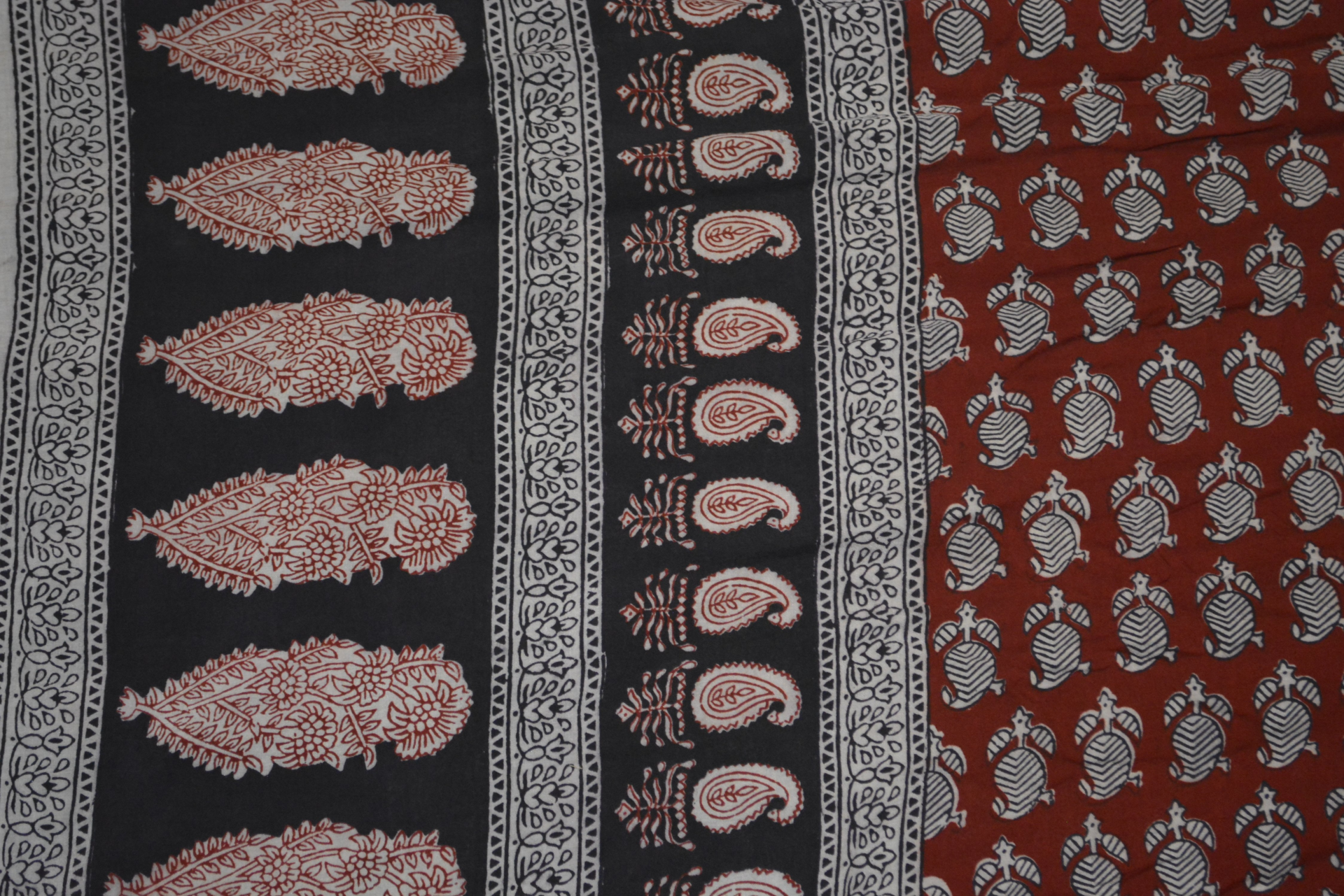 The fabric is also dyed with the plant dyes and the unique prints are derived from flowers, leaves, and barks and layouts are dramatic with the use of black and red alternately over beige featuring florid vines & ornate honeycomb borders and usually has traditional paisleys, geometrical patterns, tiny florets, buds and vine motifs with a vintage feel. The printing is done by the skilled artisans of India and the perfection of this technique is so good, that the patterns look almost as flawless as machine printed and this art form is truly magnificent.