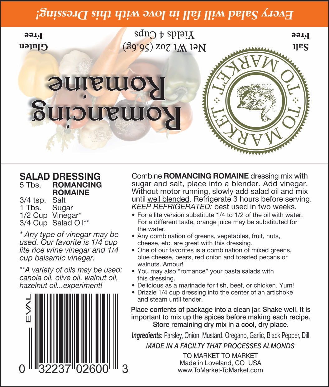 Combine ROMANCING ROMAINE dressing mix with sugar and salt, place into a blender. Add vinegar. Without motor running, slowly add salad oil and mix until well blended. Refrigerate 3 hours before serving. KEEP REFRIGERATED: best used in two weeks.