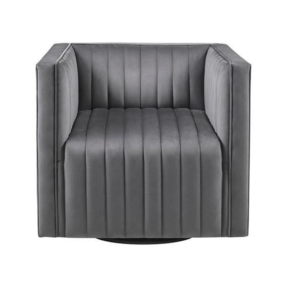 The Madison Park Sikora Channel Tufted Swivel Armchair offers a luxurious and modern update to your home décor. This swivel accent chair is upholstered in a gray polyester velvet fabric to provide a soft, rich touch and a luxurious look to any room in your home. The seat cushion, inner sides, and back feature decorative vertical channel tufting that add dimension, while French piping along the track arms completes the contemporary design. The swivel base allows the chair to rotate 360 degrees. Give any room a rich, textural update by incorporating this swivel armchair in to your space. Assembly is not required.
