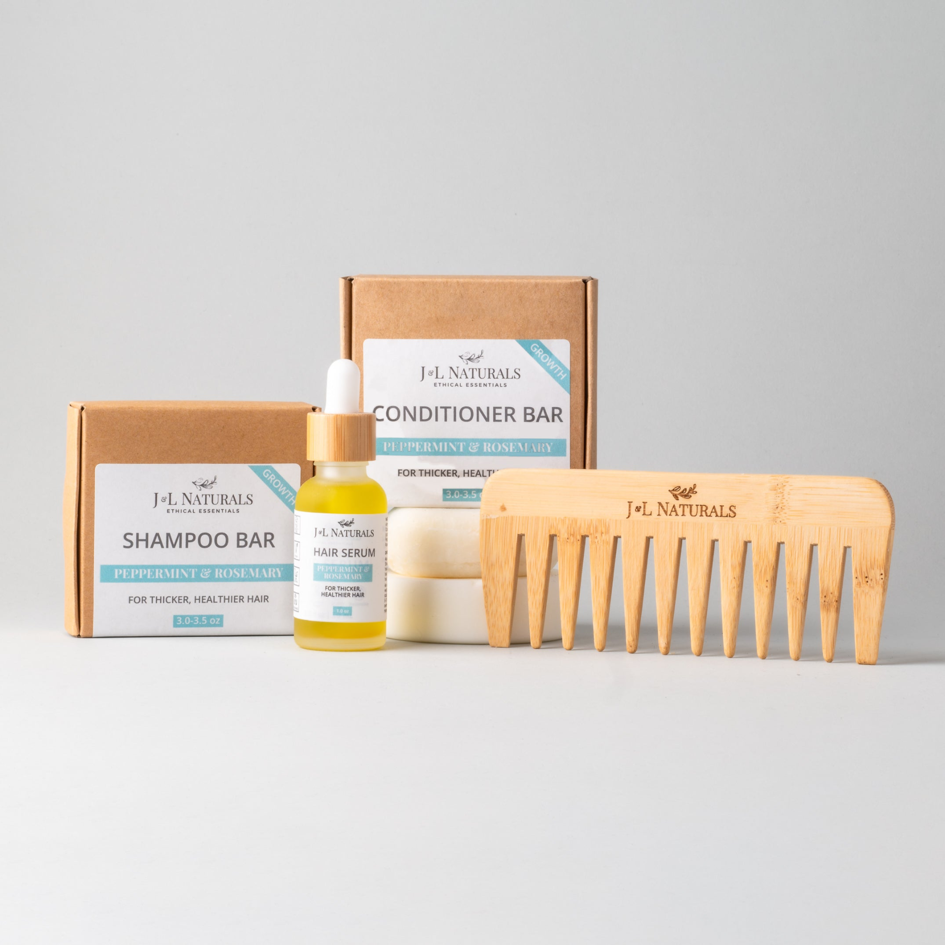 Includes: (1) 3.2oz. Shampoo Bar, (1) 3.2oz. Conditioner Bar, (1) 1oz. Hair Serum, (1) Wide-Tooth Bamboo Detangling Comb