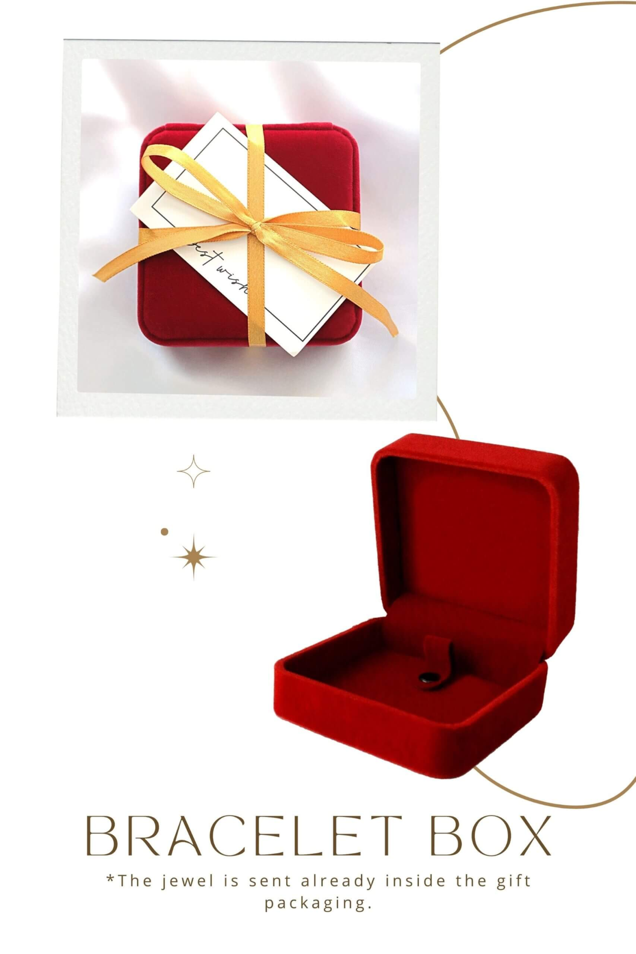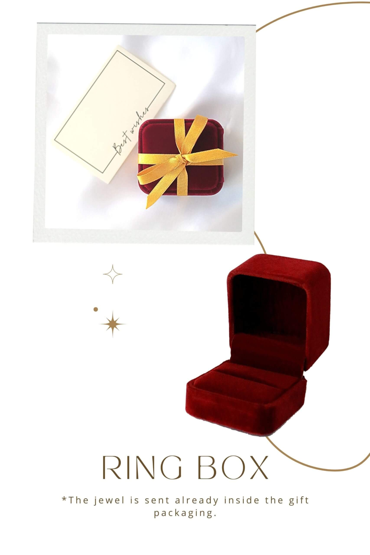 This gift wrapping set consists of a velvet box for jewelry (Earrings , necklace, ring, bracelet), silk golden ribbon and a small " BEST WISHES " card (the card is sent empty so that you can fill it with your own words).