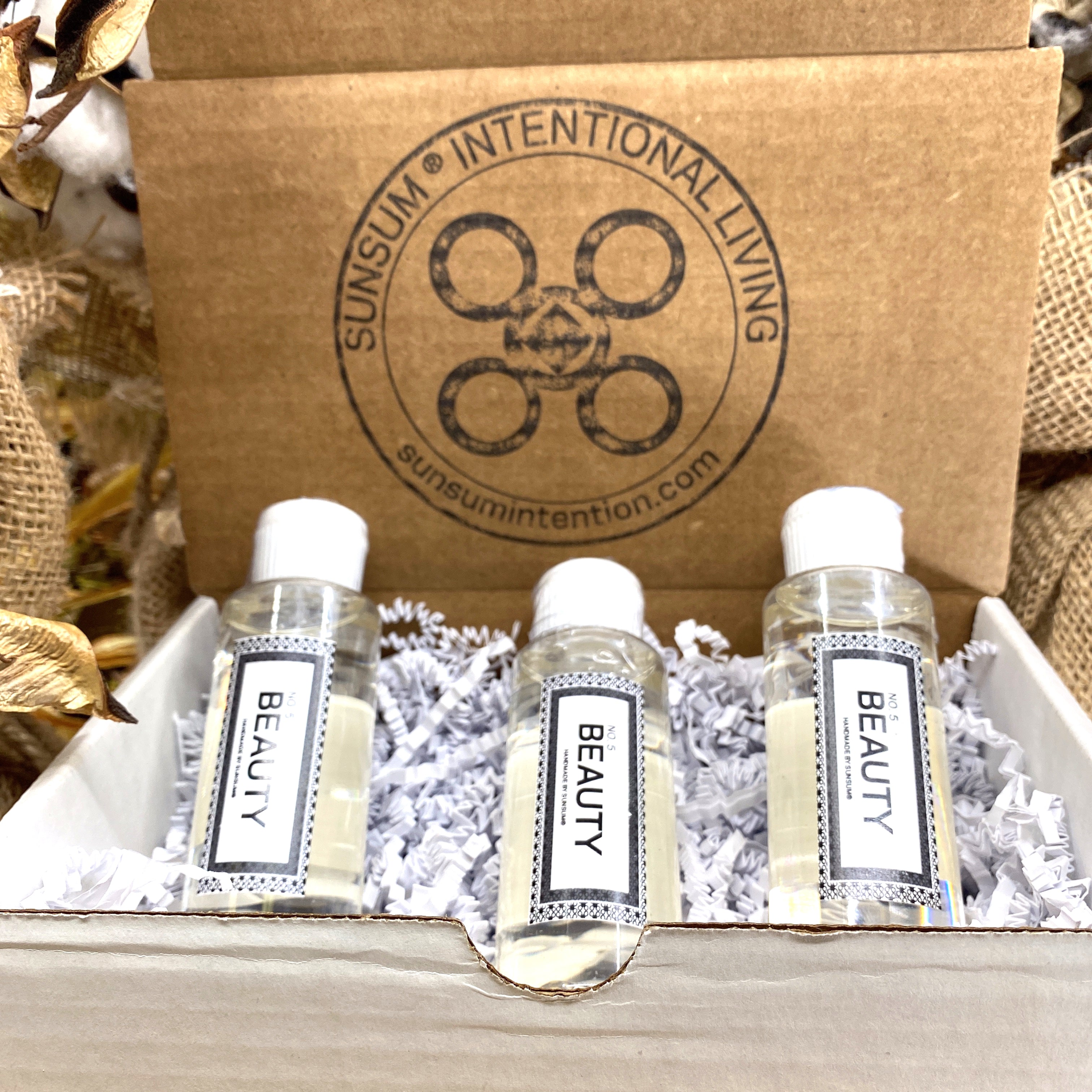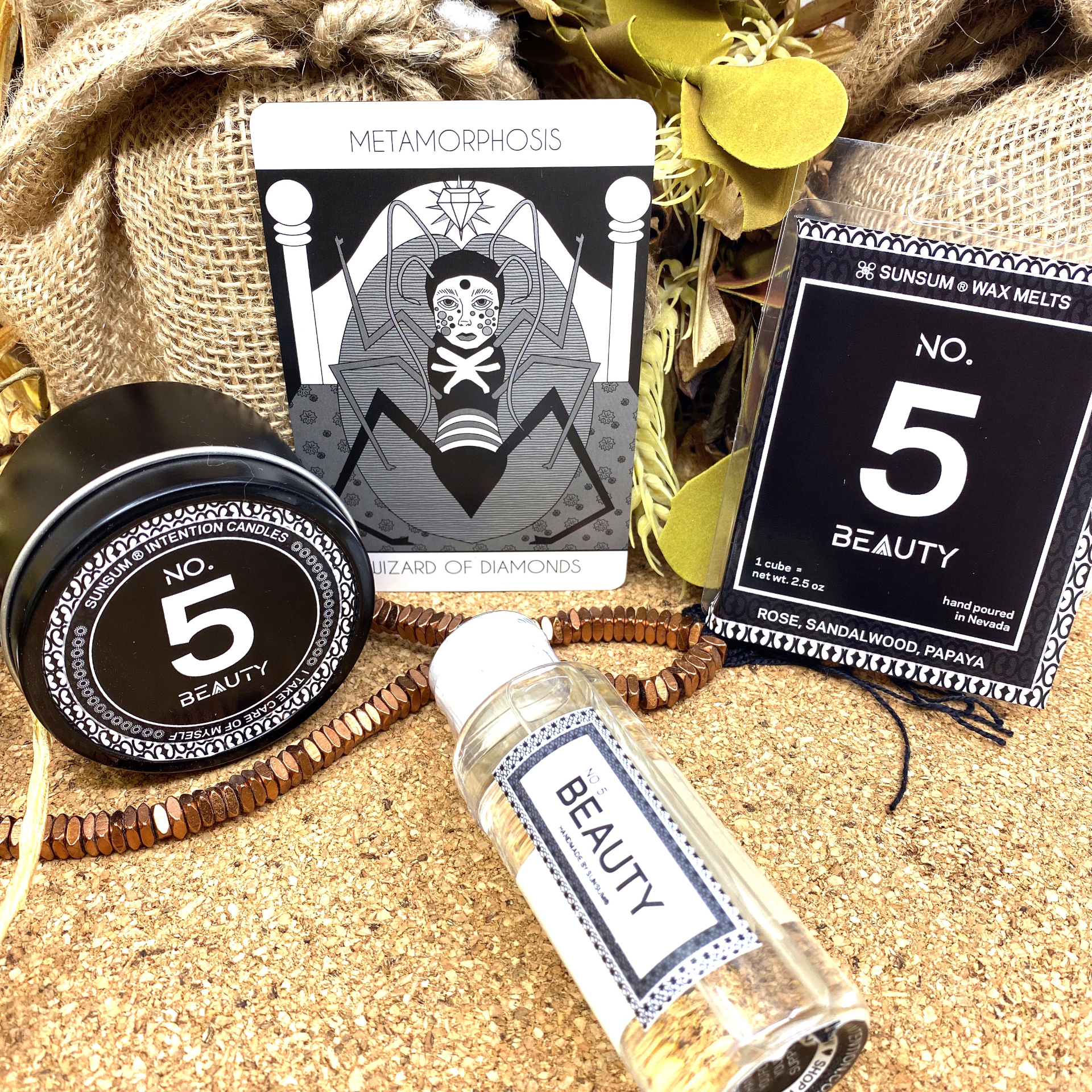 Oblige your spirit guide, with the Spirit Number 555 Gift Set. Enhanced with handmade products from the No. 5 - Beauty collection. Fill your space with the sweet and clarifying aromas of rose, papaya, and sandalwood.