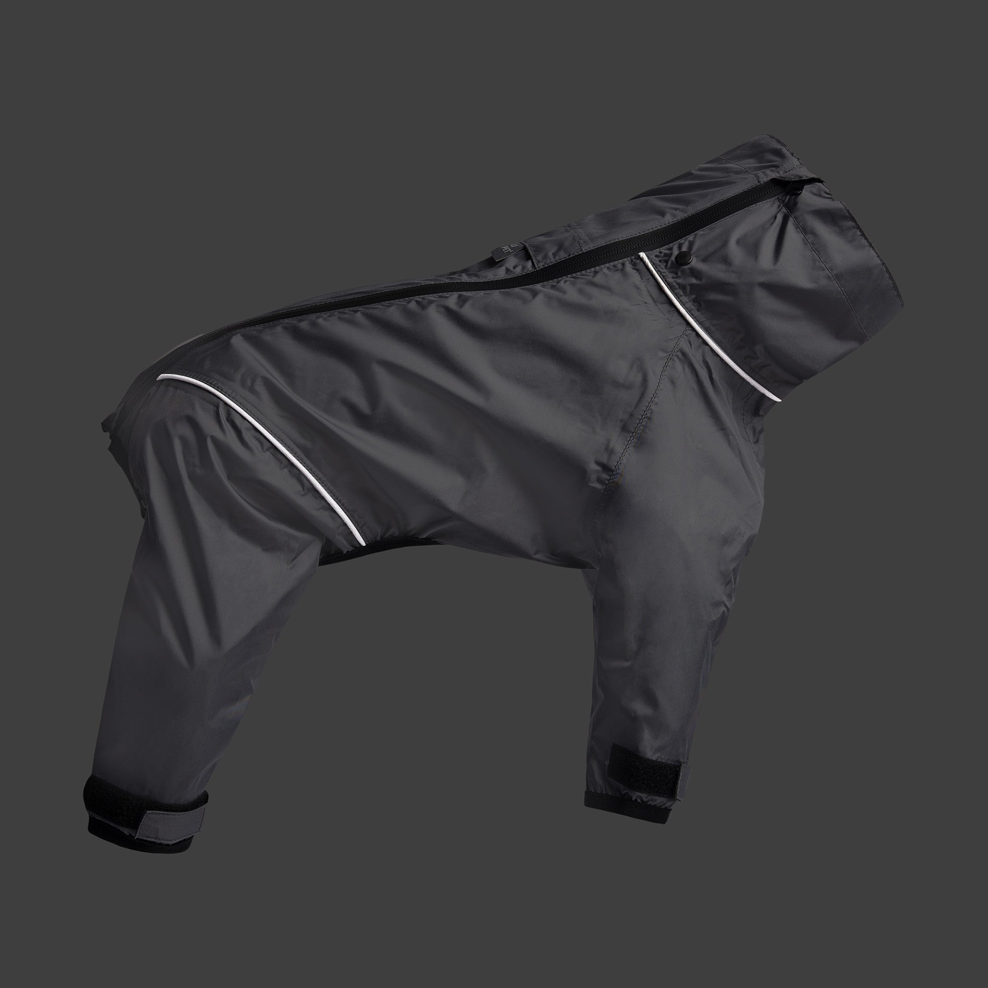 - Long, full 4-leg coverage, high neck, adjustable cuffs and back vent for leash.