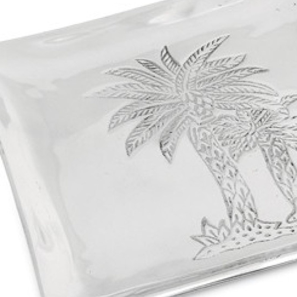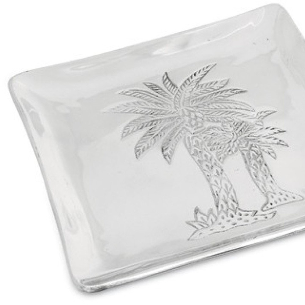 This Square Silver Palm Tree Plate with embossed palm tree design is ther perfect way to bring some tropical fun to your dinner table. This plate or small serving platter is made of food-safe stainless steel and has been finished to high silver shine. The square shape is elevated with the soft curved edges of the tray. The embossed design features two palm trees next to each other and adds a fun and tropical element to your decor. This serving platter can be used to serve food whenever you're hosting and it can also be used around the house for extra storge and decor. 1" H x 9" W x 9" D