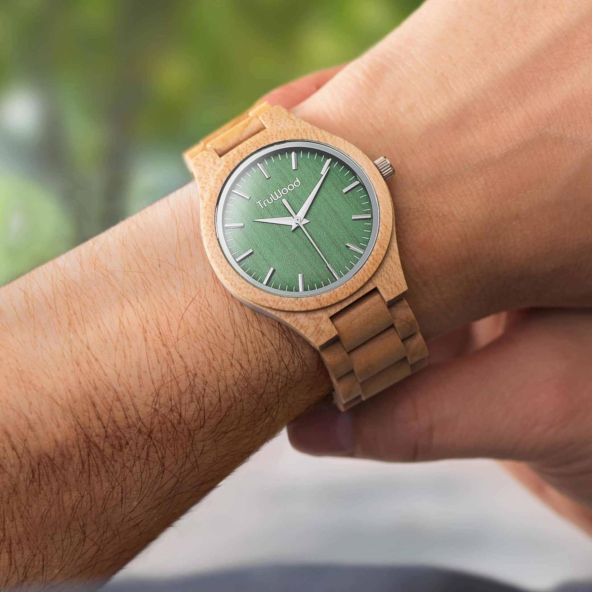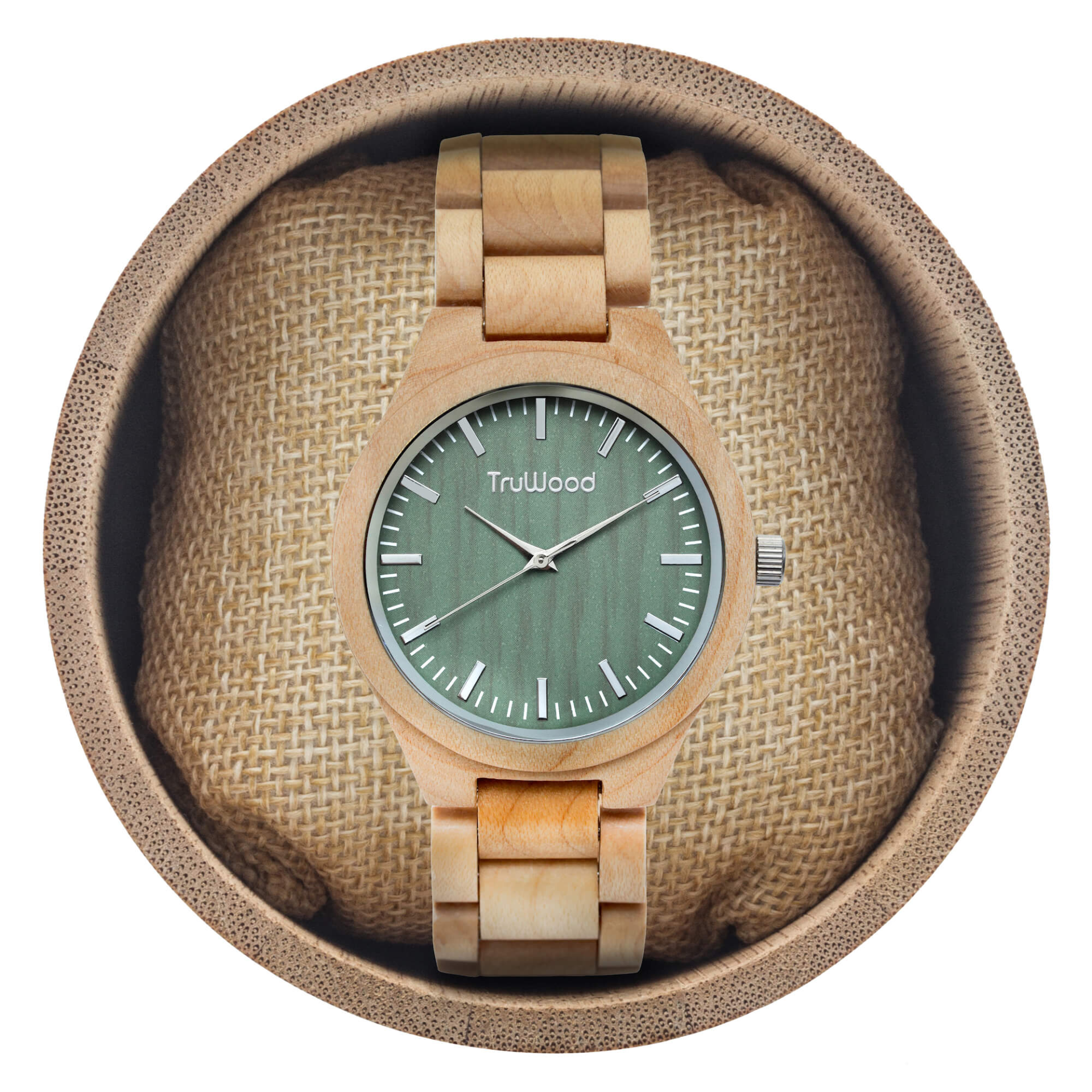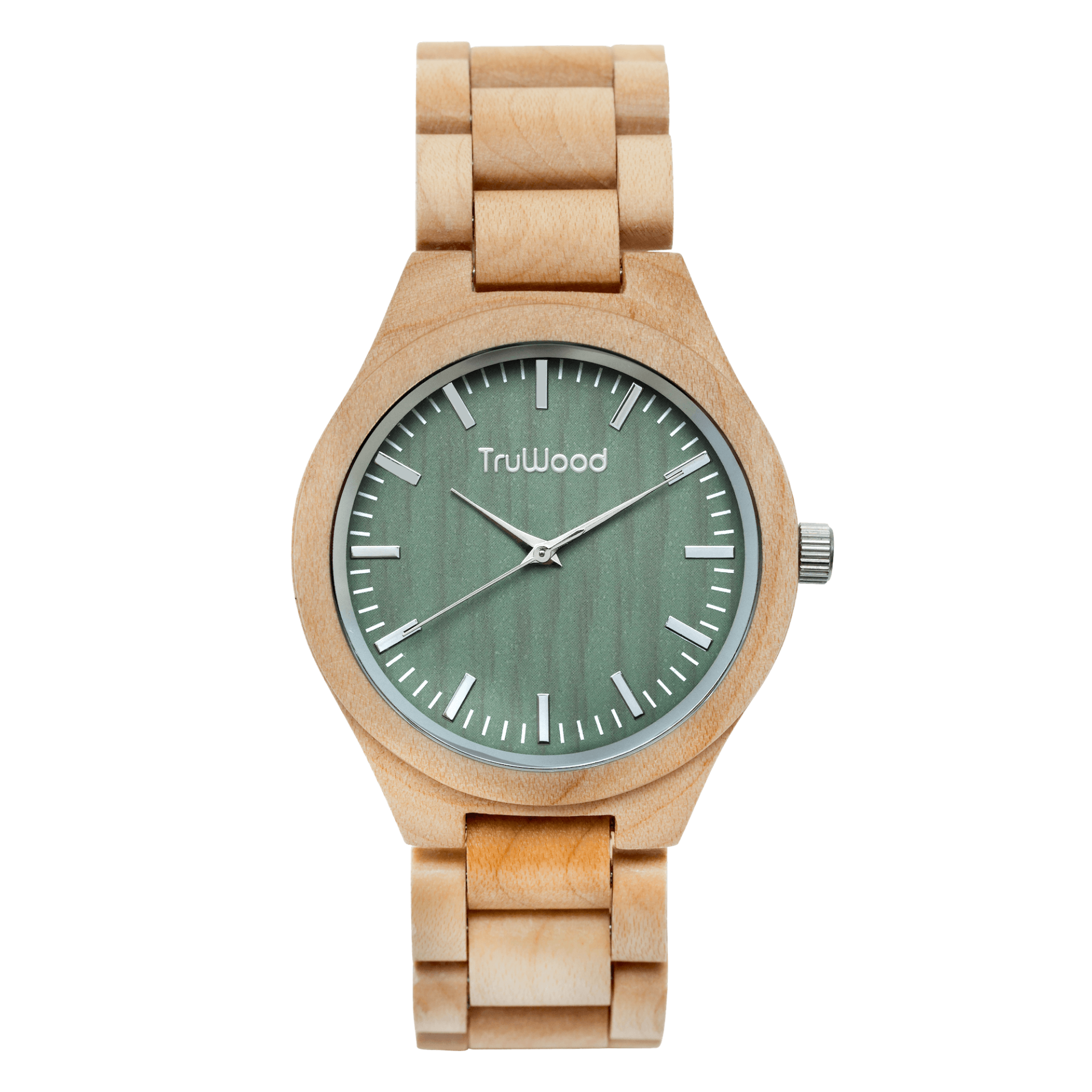 Everyday elegance has never been so accurate a description for any timepiece. The TruWood Stark is handcrafted by expert watchmakers, built on excellence and never cutting corners. The light maple wood case is polished to ensure a uniform grain and specially cured for water resistance in a stunning slim profile. Silver hands stand out on the Stark's signature green dial housed in a sapphire coated crystal glass, providing the perfect bridge between bold and simplicity. The lightweight wooden links complete the Stark as your most comfortable watch ever.