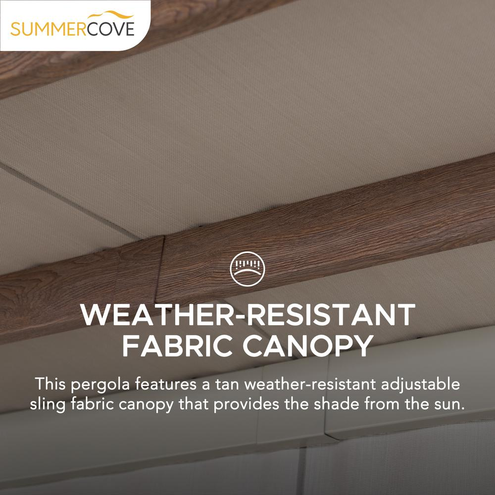 MATERIALS AND STRUCTURE: This white and woodgrain finish steel frame pergola is sturdy and is powder-coated for rust resistance. Steel triangle braces on each leg and beam provide additional structural strength and support ADJUSTABLE CANOPY: This pergola comes with a canopy that can be independently adjusted to provide shade or sunlight to your preference. The canopy is retractable allowing ultimate flexibility to adjust either side ENJOY OUTDOOR LIFE: Light gray weather-resistant adjustable fabric shade guarantees your privacy. The pergola made of steel with a natural wood-looking finish provides an attractive visual aesthetic ITEM DIMENSIONS: 171.7 in. L x 147.6 in. W x 87.4 in. H ITEM WEIGHT: 339.63 lbs This canopy is easily adjusted using the handles on each side that allow you to fully customize the level of sun and shade that your outdoor space receives throughout the day The triangulated steel braces connecting each leg and beam provide additional structural strength and support, making the pergola sturdy and stable Features a power-coated steel frame. The pergola is built for strength and stability that will provides all seasons shelter for your family. The canopy can be removed or installed easily as the weather requires