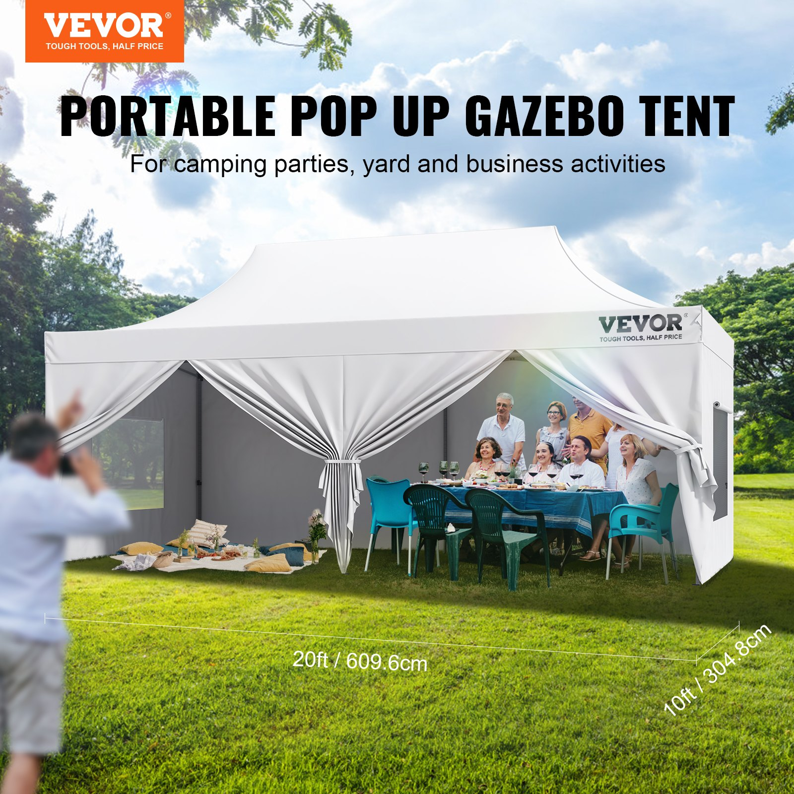 VEVOR 10x20 FT Pop up Canopy with Removable Sidewalls, Instant Canopies Portable Gazebo & Wheeled Bag, UV Resistant Waterproof, Enclosed Canopy Tent for Outdoor Events, Patio, Backyard, Party, Parking