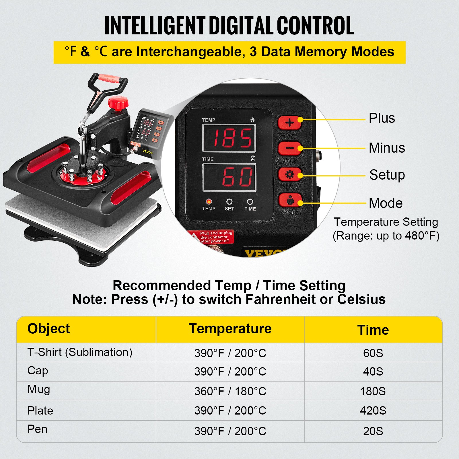 Mug Press Pads: 6/9/11/12 OZ,Aluminum Pot Press: 6.3 in / 16 cm,Shoes Heating Pad: 11x15x0.6 in / 28x38x1.5 cm,Length of the Cable: 3.3 ft / 1 m,Pen Heating Pad: 9.4x2.4x1.6 in / 24x6x4 cm,The Highest Temperature: 410°F / 210℃,Weight: 31 lbs / 14 kg,Rated Voltage: 110 V,Product Size: 15x17.8x18 inch / 38x45x46 cm,Rated Frequency: 50-60 Hz,Hat/Cap Press: 5.5"x3" / 14x8 cm,Plate Press Pads: 8"/10" max diameter,Model: P8100,Rated Power: 800 W,Transfer Size: 15"x12" / 38x30 cm
