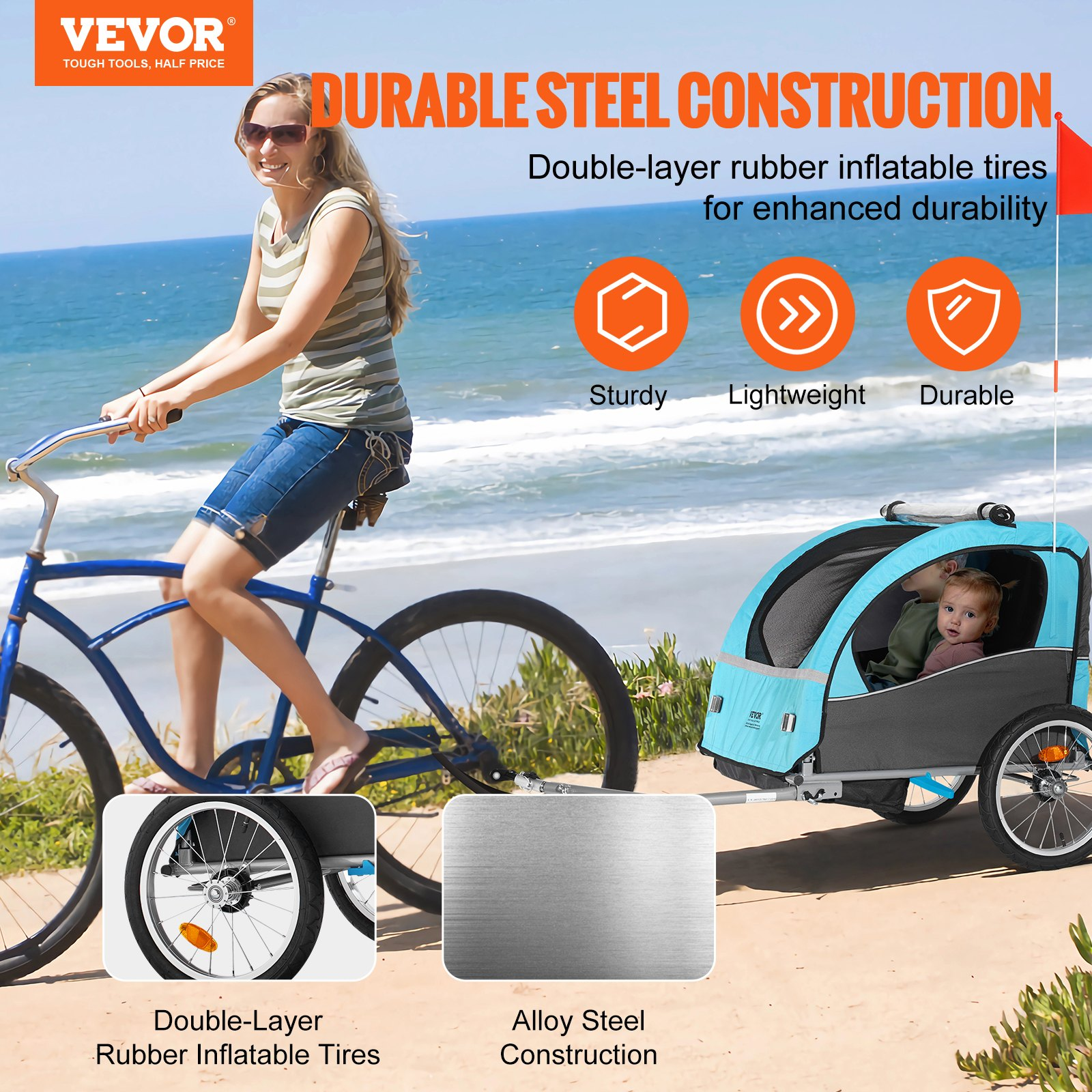 VEVOR Bike Trailer for Toddlers, Kids, Double Seat, 110 lbs Load, Tow Behind Foldable Child Bicycle Trailer with Universal Bicycle Coupler, Canopy Carrier with Strong Carbon Steel Frame, Blue and Gray