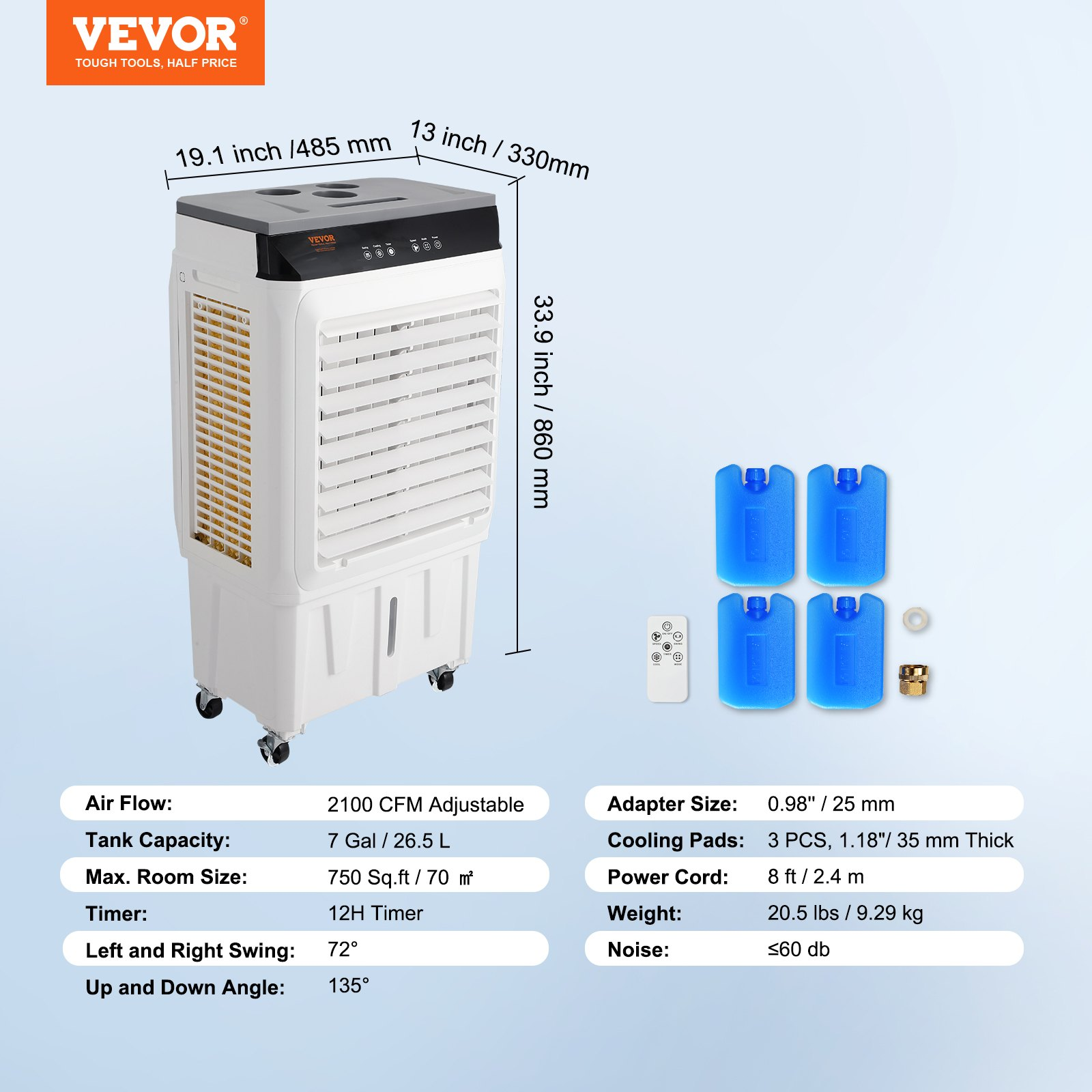 VEVOR Evaporative Air Cooler, 2100 CFM, 135° Oscillating Swamp Cooler with Adjustable 3 Speeds and 12 H Timer, 7 Gal Portable Air Cooler for 750 Sq.ft, Indoor/Outdoor Use