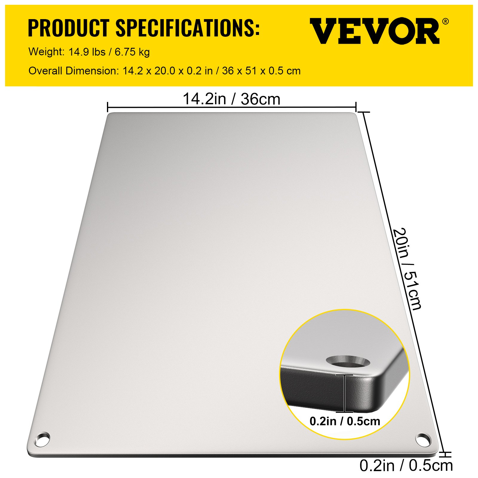 Thickness: 0.2 in / 5 mm,Max Temperature: 572℉ / 300℃,Item Dimension: 14.2 x 20.0 x 0.2 in / 36 x 51 x 0.5 cm,Color: Silver,Model: vv-ps-055136,Material: Steel,Coating: Double-sided Coating,Finish: Teflon Coating,Item Weight: 14.9 lbs / 6.75 kg