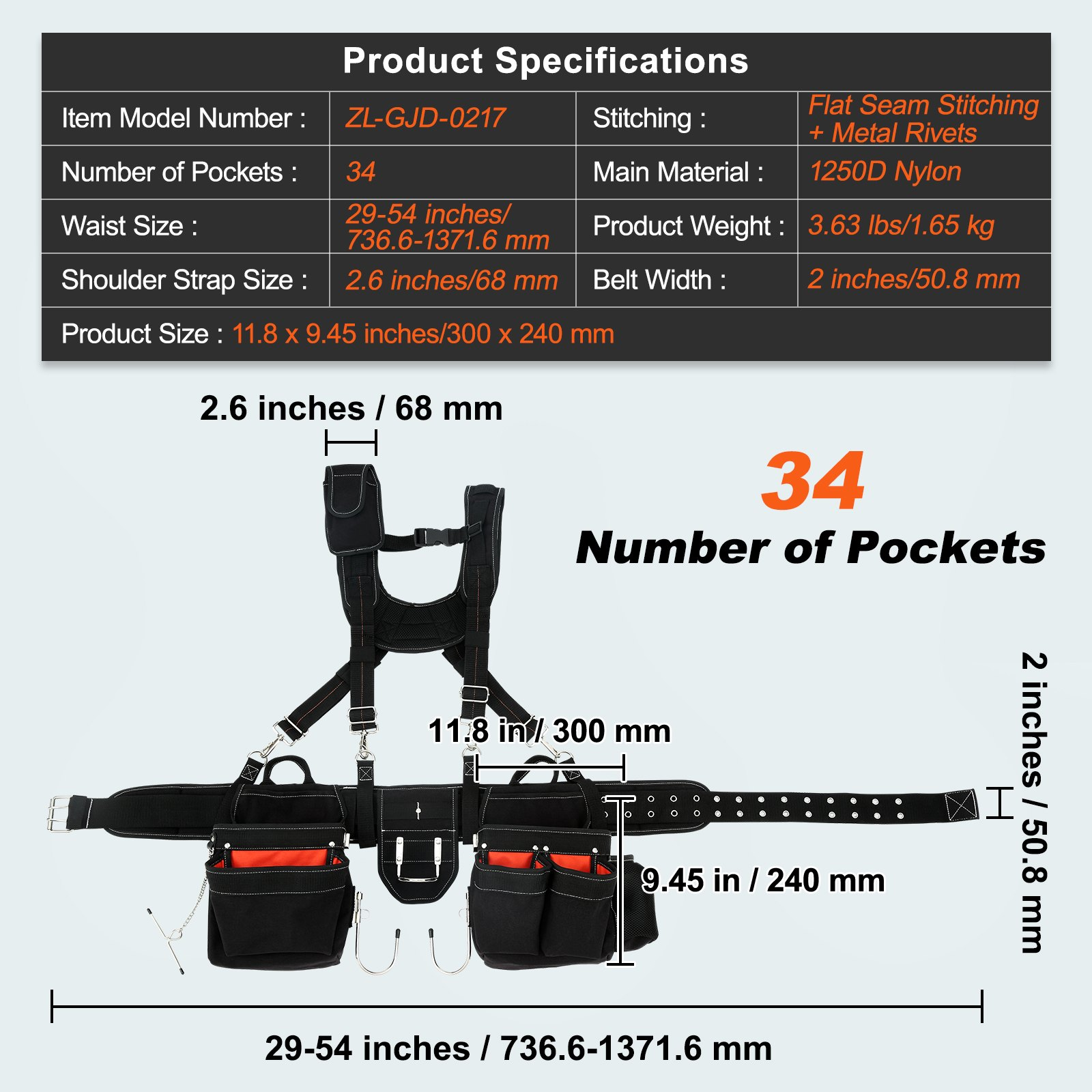 Waist Size: 29-54 inches/736.6-1371.6 mm,Belt Width: 2 inches/50.8 mm,Shoulder Strap Size: 2.6 inches/68 mm,Item Model Number: ZL-GJD-0217,Product Weight: 3.63 lbs/1.65 kg,Number of Pockets: 34,Stitching: Flat Seam Stitching + Metal Rivets,Main Material: 1250D Nylon,Product Size: 11.8 x 9.45 inches/300 x 240 mm