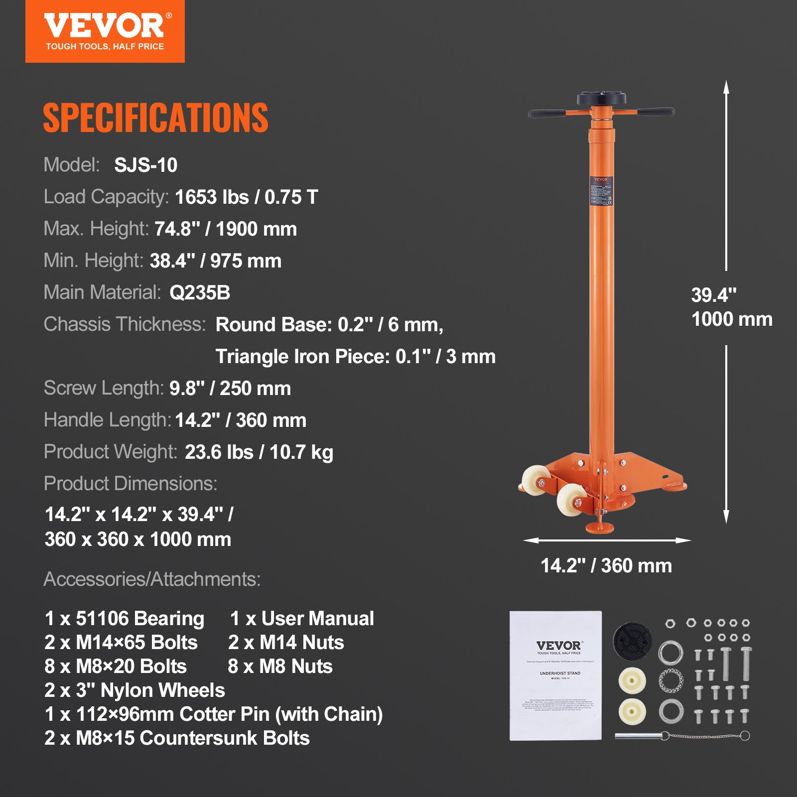 Min. Height: 38.4" / 975 mm,Handle Length: 14.2" / 360 mm,Max. Height: 74.8" / 1900 mm,Load Capacity: 1653.5 lbs / 0.75 t,Screw Length: 9.8" / 250 mm,Item Model Number: SJS-10,Product Weight: 23.6 lbs / 10.7 kg,Chassis Thickness: Round Base: 0.2" / 6 mm, Triangle Iron Piece: 0.1" / 3 mm,Product Dimensions: 14.2" x 14.2" x 39.4" / 360 x 360 x 1000 mm,Main Material: Q235B