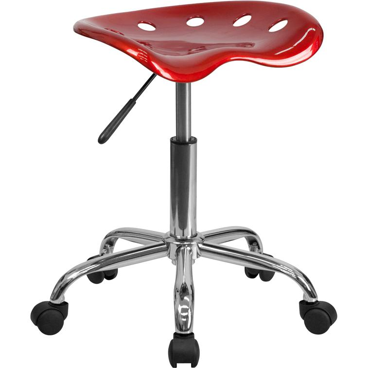 Tractor Style Stool Wine Red Finish Comfort Molded "Tractor" Seat High Density Polymer Construction 360 Degree Swivel Seat Pneumatic Seat Height Adjustment 5.5" Height Range Adjustment Heavy Duty Chrome Base Dual Wheel Casters Designed for Residential Use Only