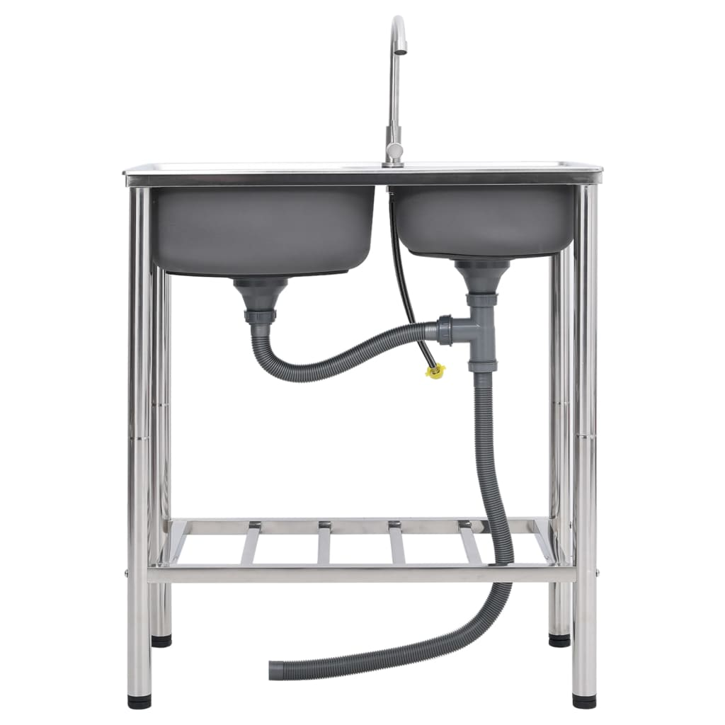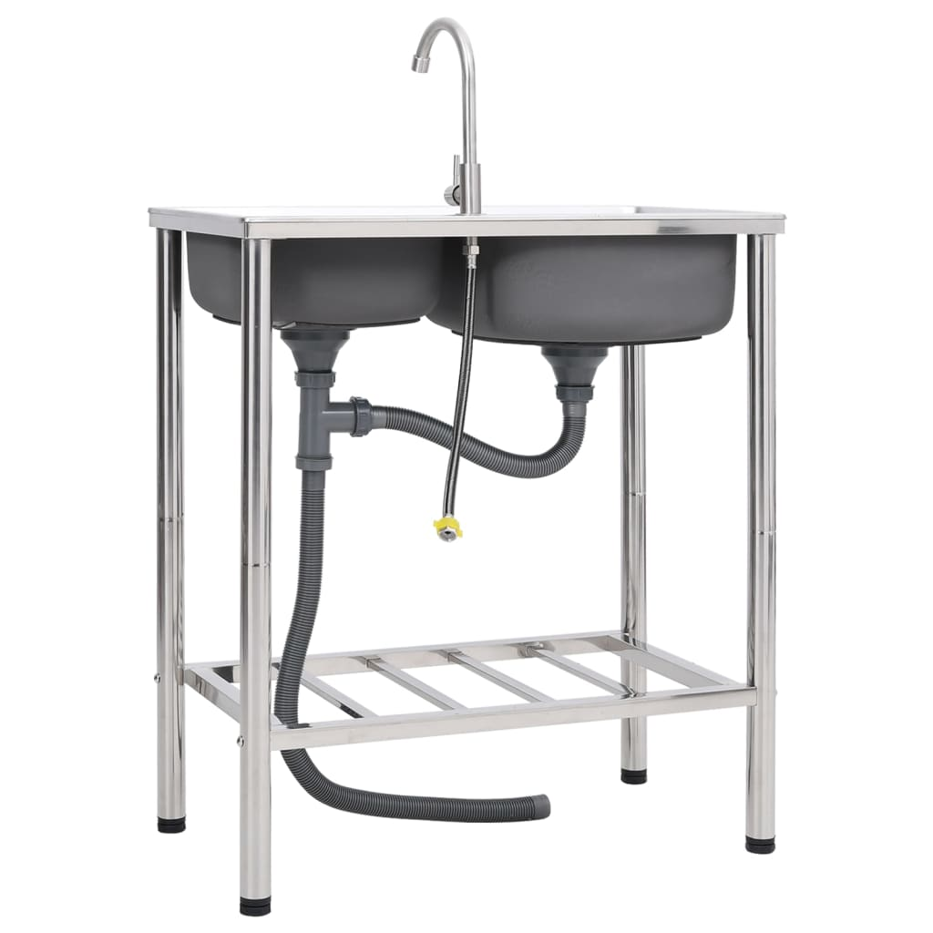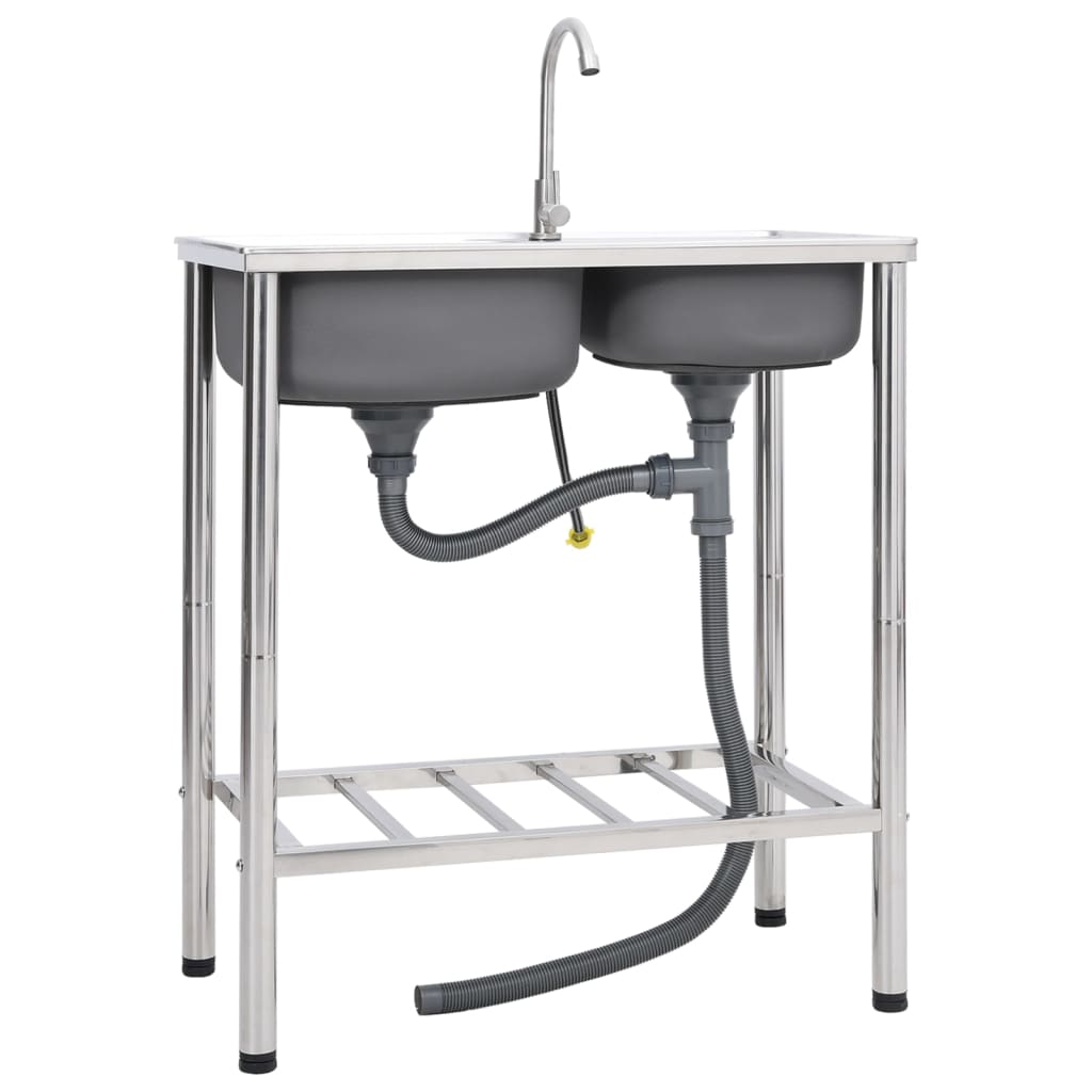 vidaXL Camping Sink Double Basins with Tap Stainless Steel
