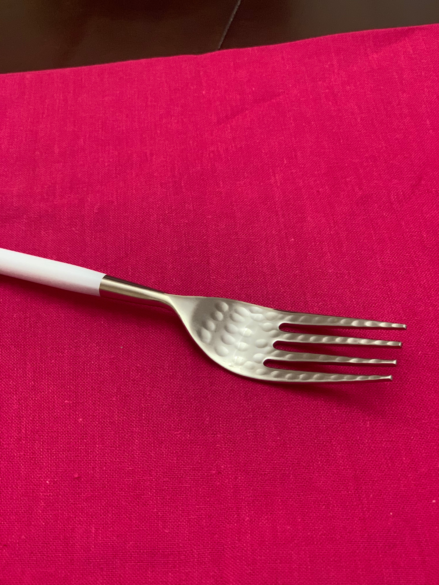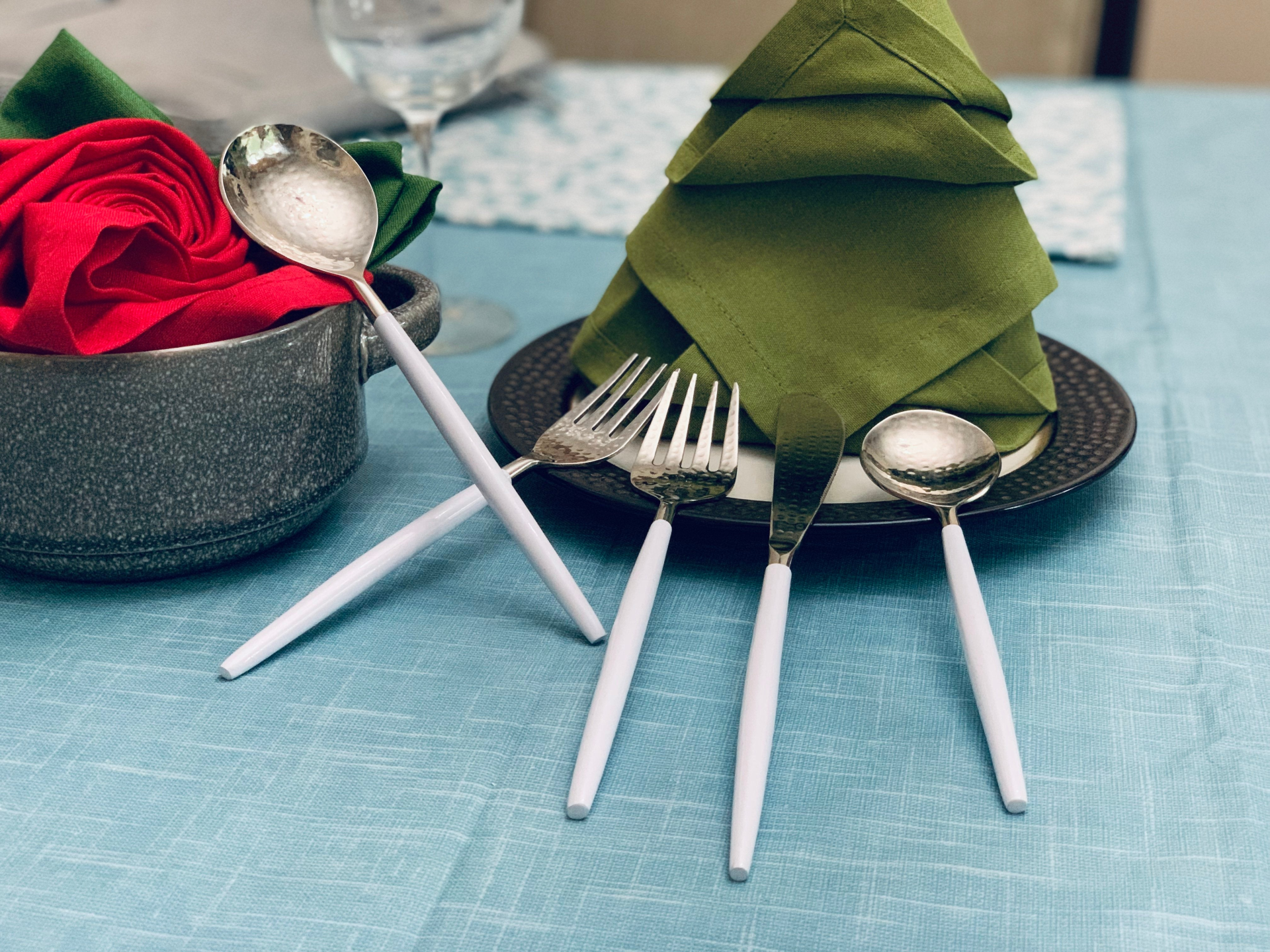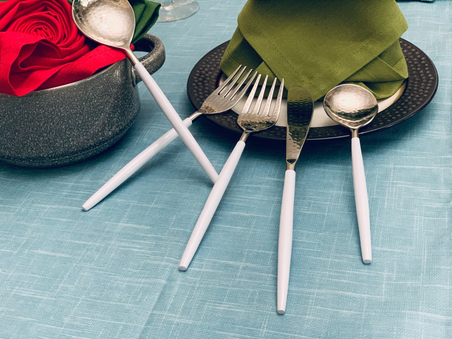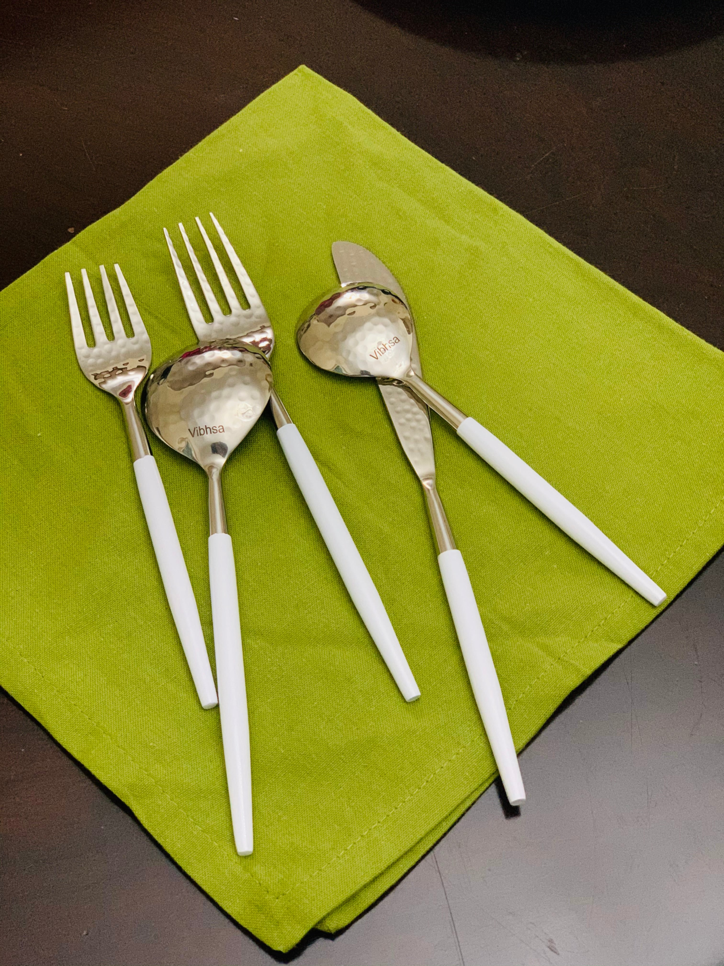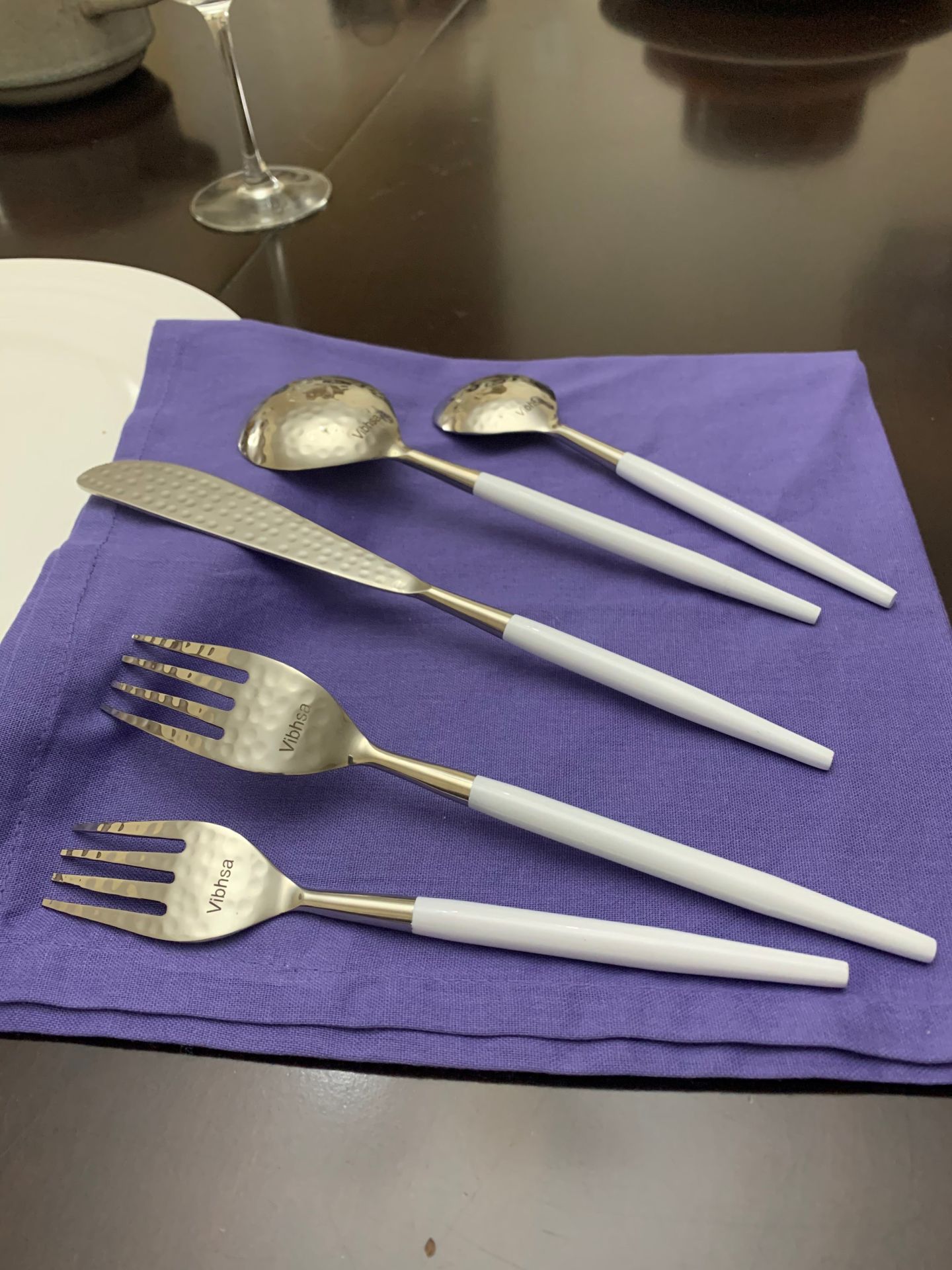 - Made by artisan Stainless Steel cutlery set. White powder coated handle with High Gloss Finish gives a classic look to your parties. Hammered mouth gives a unique look to your table setting