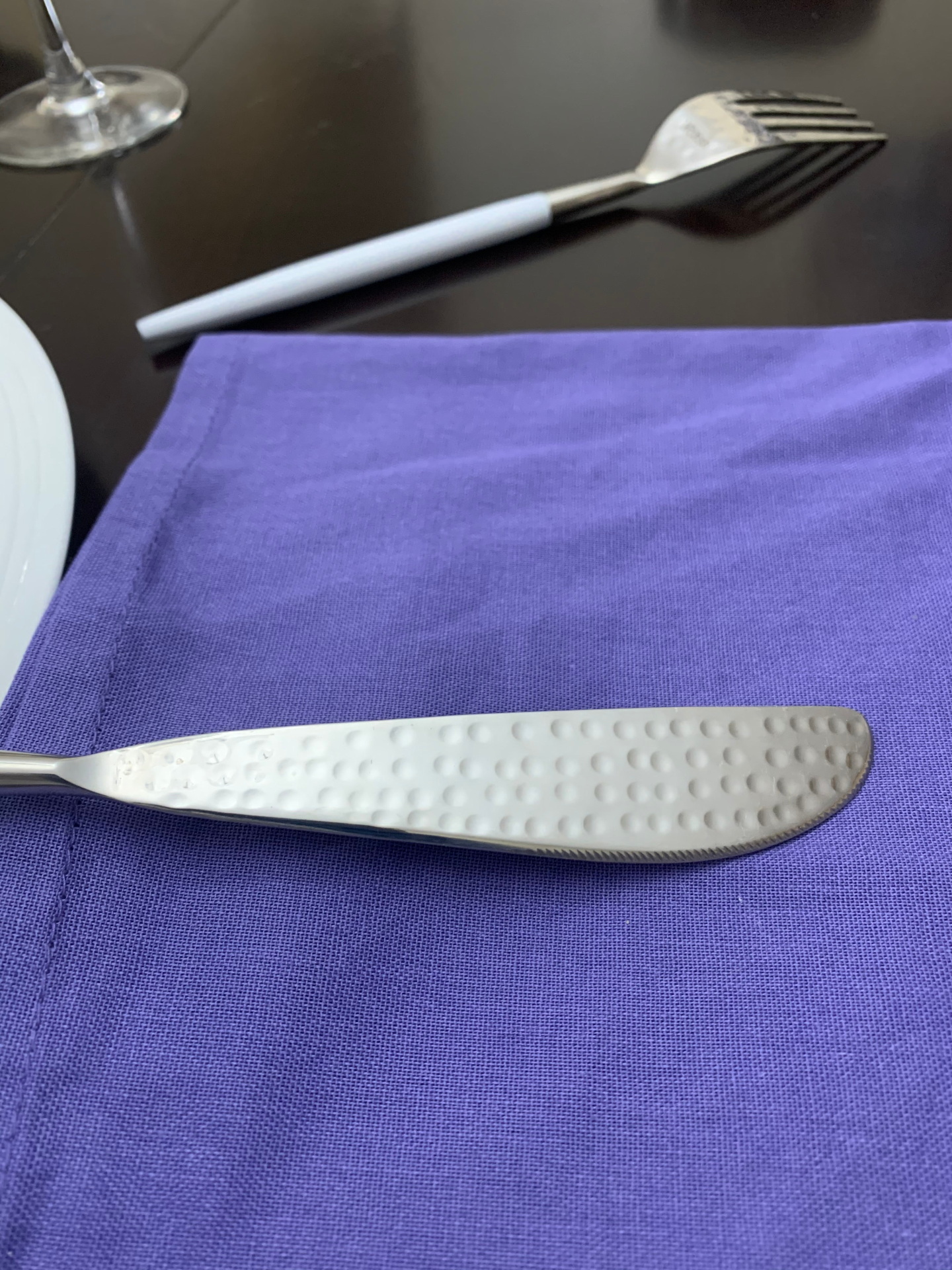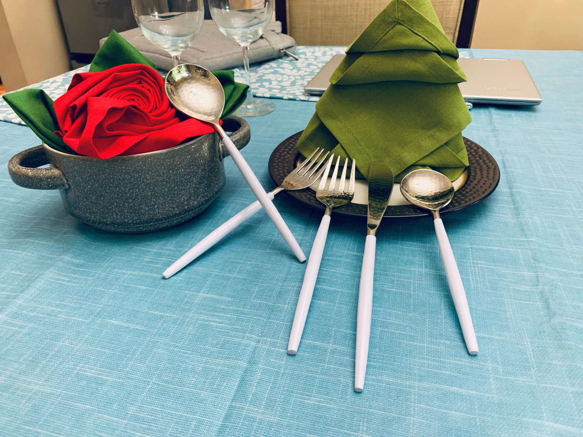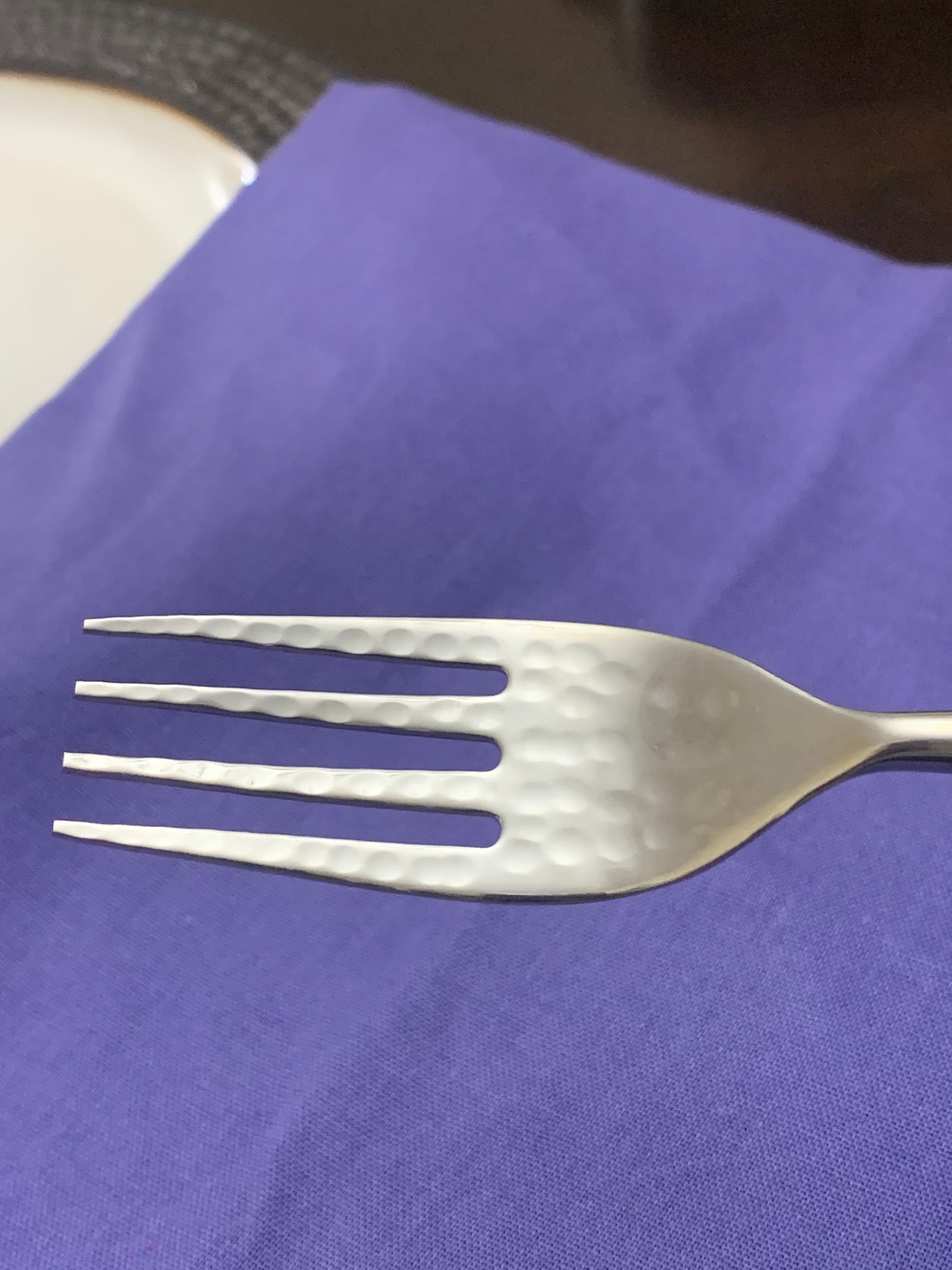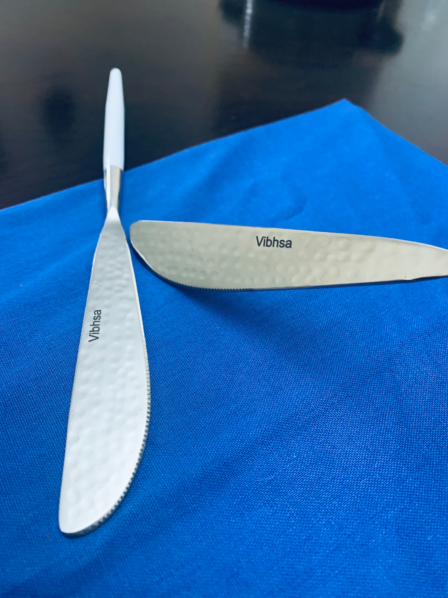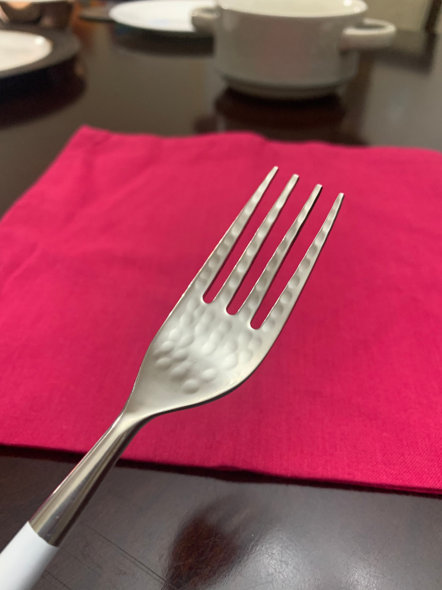 - Made by artisan Stainless Steel cutlery set. White powder coated handle with High Gloss Finish gives a classic look to your parties. Hammered mouth gives a unique look to your table setting